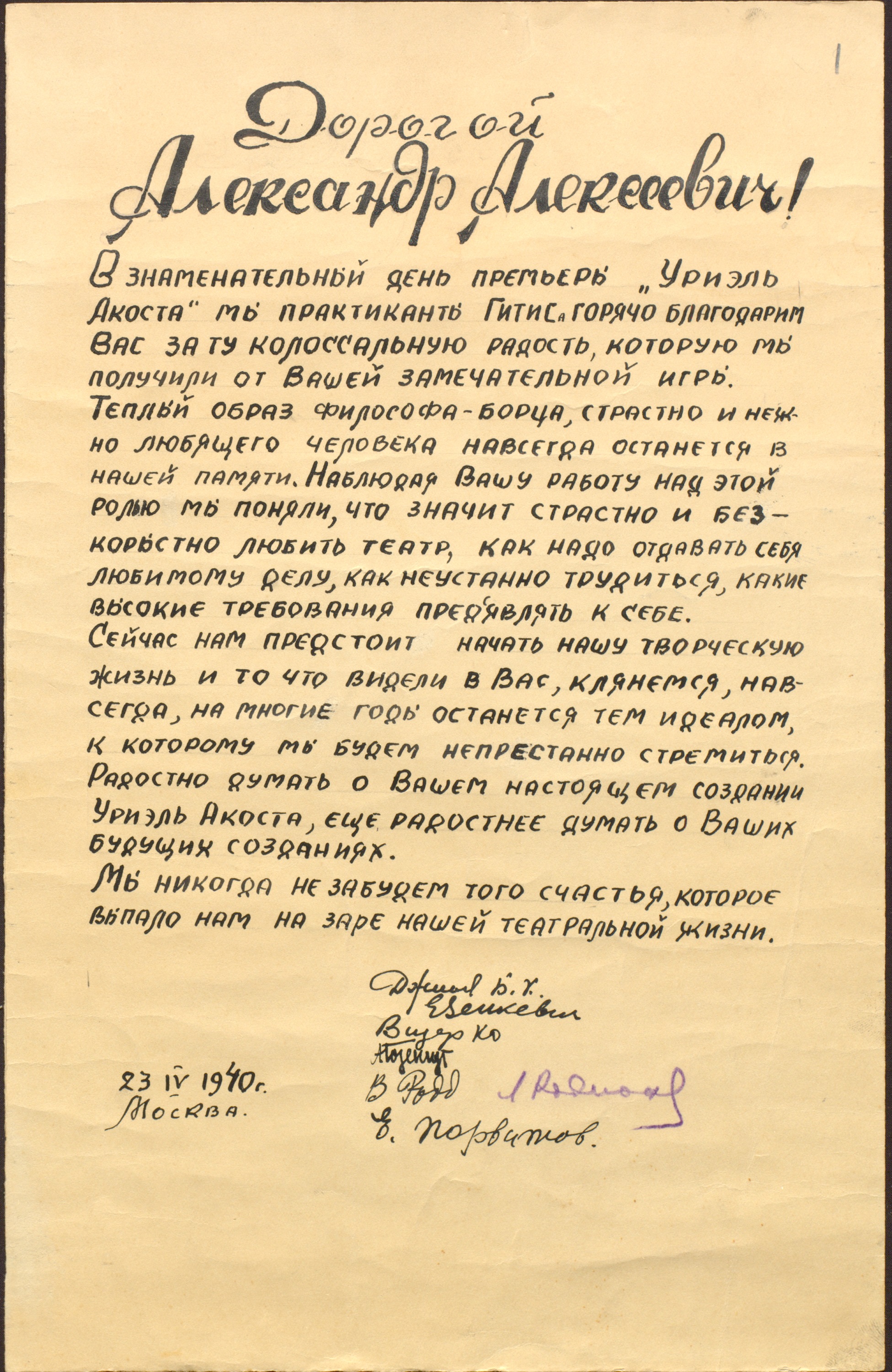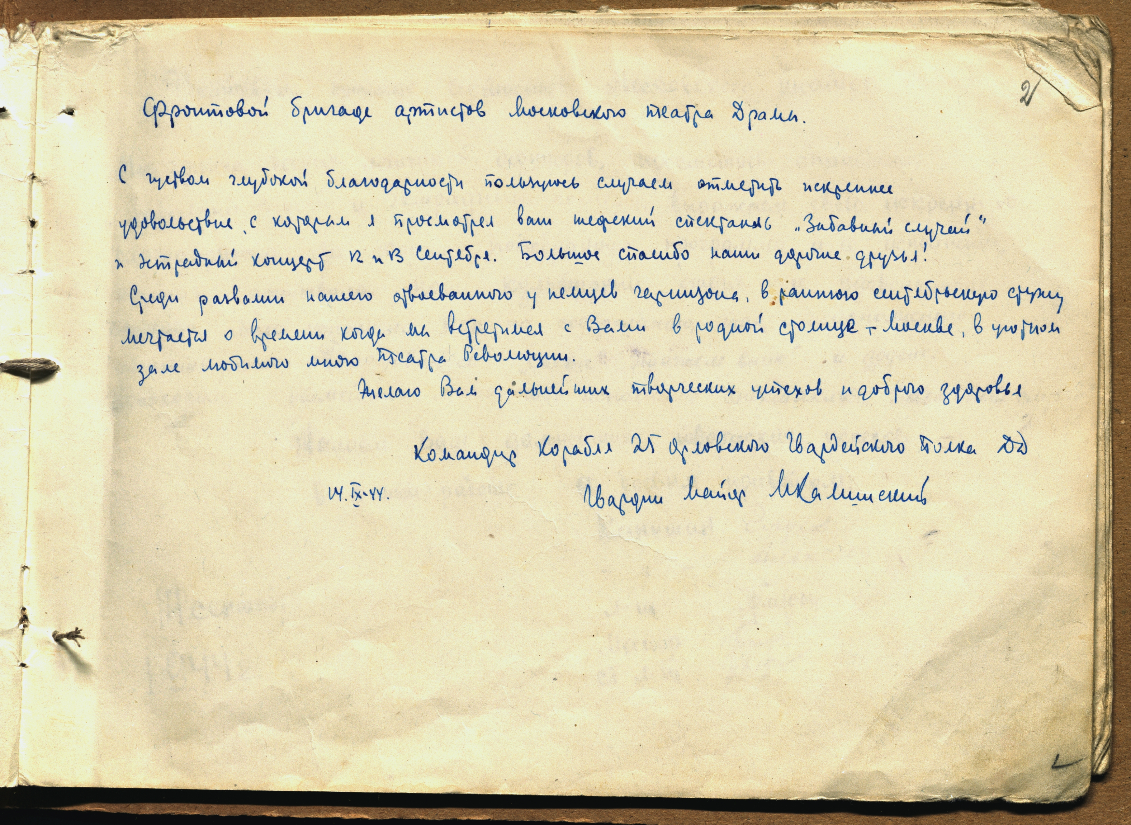 Адрес артистов фронтовой бригады Малого театра А.А. Остужеву. Март 1943 г. Рукопись с автографами Н.Л. Афанасьева, А.М. Лениной, В.Н. Аксенова, Н.А. Арди, С.Г. Розенфельд, В.А. Слободинской и др. Ф. 2016. Оп. 1. Ед. хр. 28. Л. 1, 2
