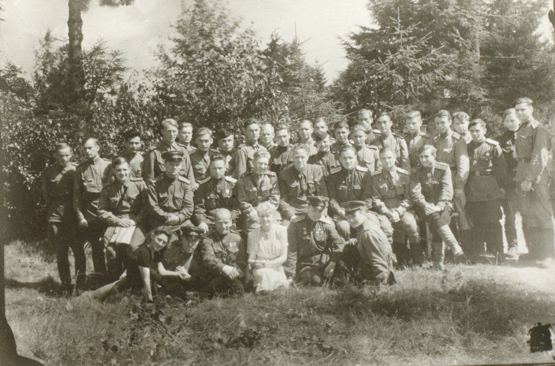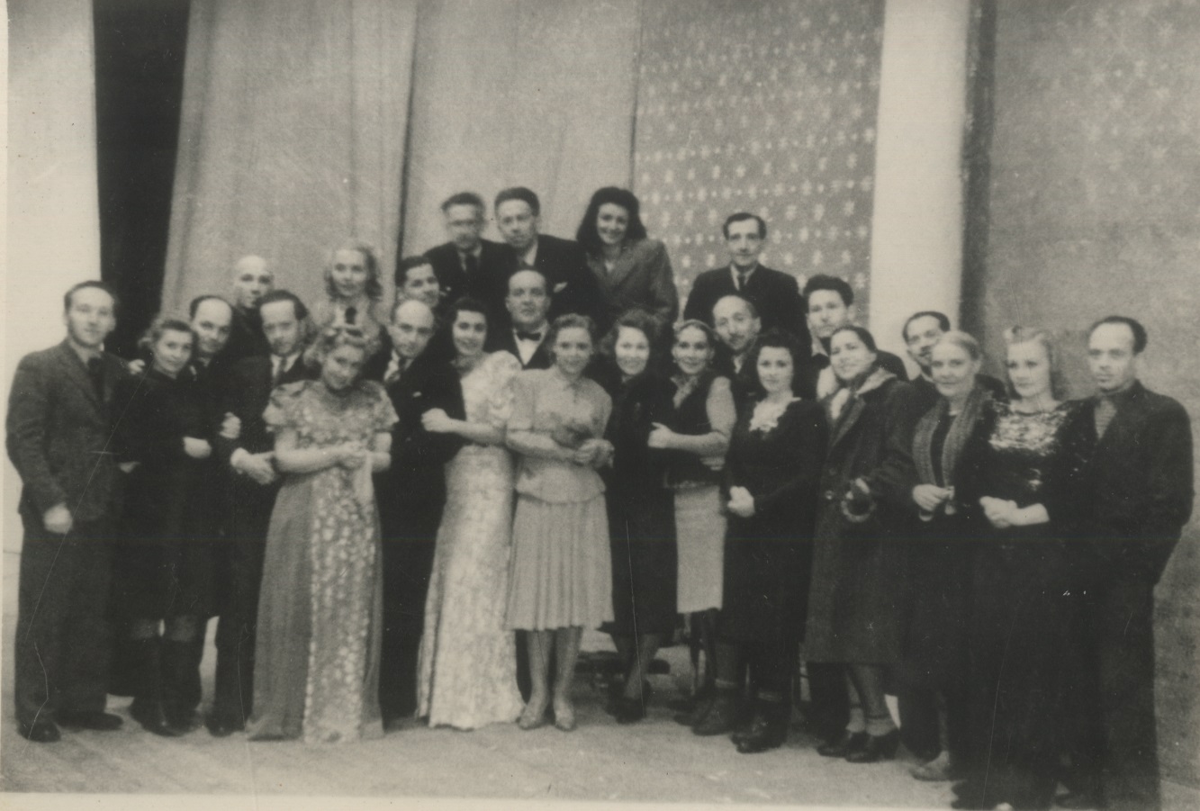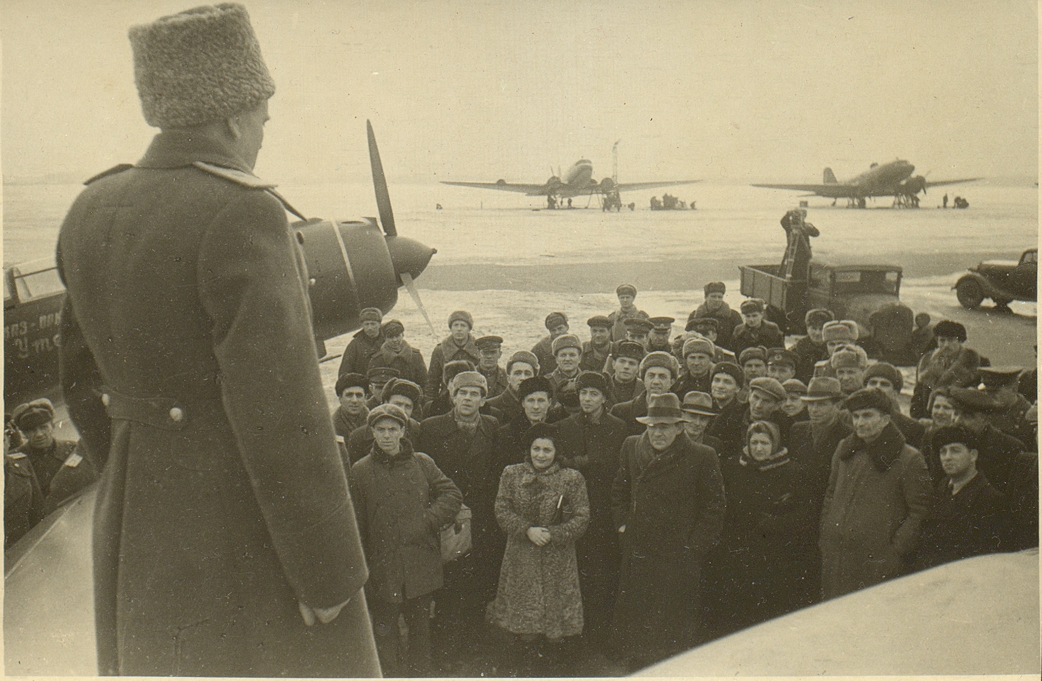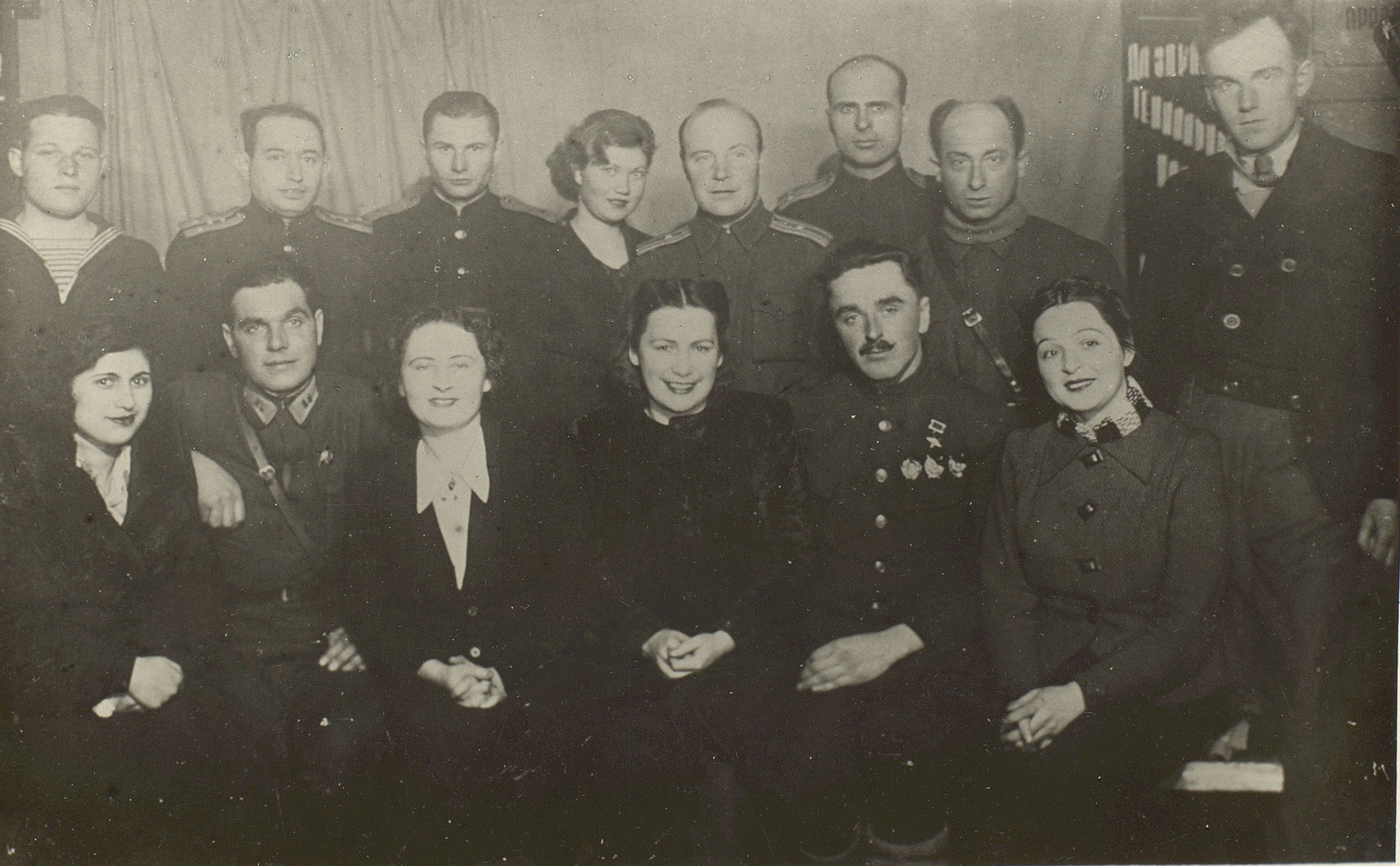 Фотография участников фронтовой бригады Московского театра драмы во время выезда на фронт. В первом ряду сидят (слева направо): актрисы Н.М. Тер-Осипян и А.Я. Москалева, командир 36-й авиационной дивизии дальнего действия, генерал-майор авиации В.Ф. Дрянин, вокалистка [Г.А. Барилко], артист оркестра [И.Г. Дегтяр]. Во втором ряду стоят (слева направо): [Д. Будянская], артист оркестра В.А. Голубев, актер Л.Н. Свердлин (второй слева во втором ряду), неустановленные лица, актеры В.А. Латышевский и Л.Н. Титов, артист оркестра А.Н. Курич. Г. Щучин Гродненской обл. Белорусской ССР. [22] января 1945 г. Ф. 2953. Оп. 1. Ед. хр. 614. Л. 3