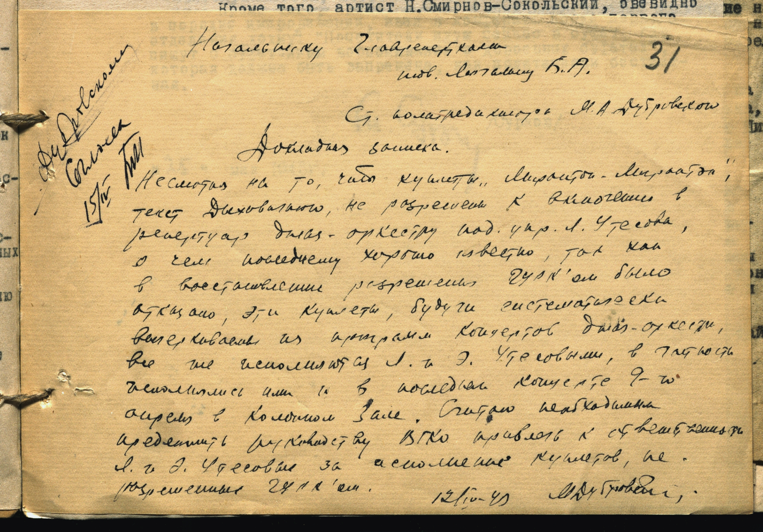 Докладная записка старшего политредактора отдела контроля КПДИ при СНК СССР М.А. Дубровского начальнику Главреперткома Б.А. Мочалину об исполнении джаз-ансамблем Л.О. Утесова запрещенных ГУРКом куплетов В.А. Дыховичного на концерте 9 апреля в Колонном зале Дома Союзов. 12 апреля 1943 г. Рукопись. Ф. 962. Оп. 3. Ед. хр. 1163. Л. 31