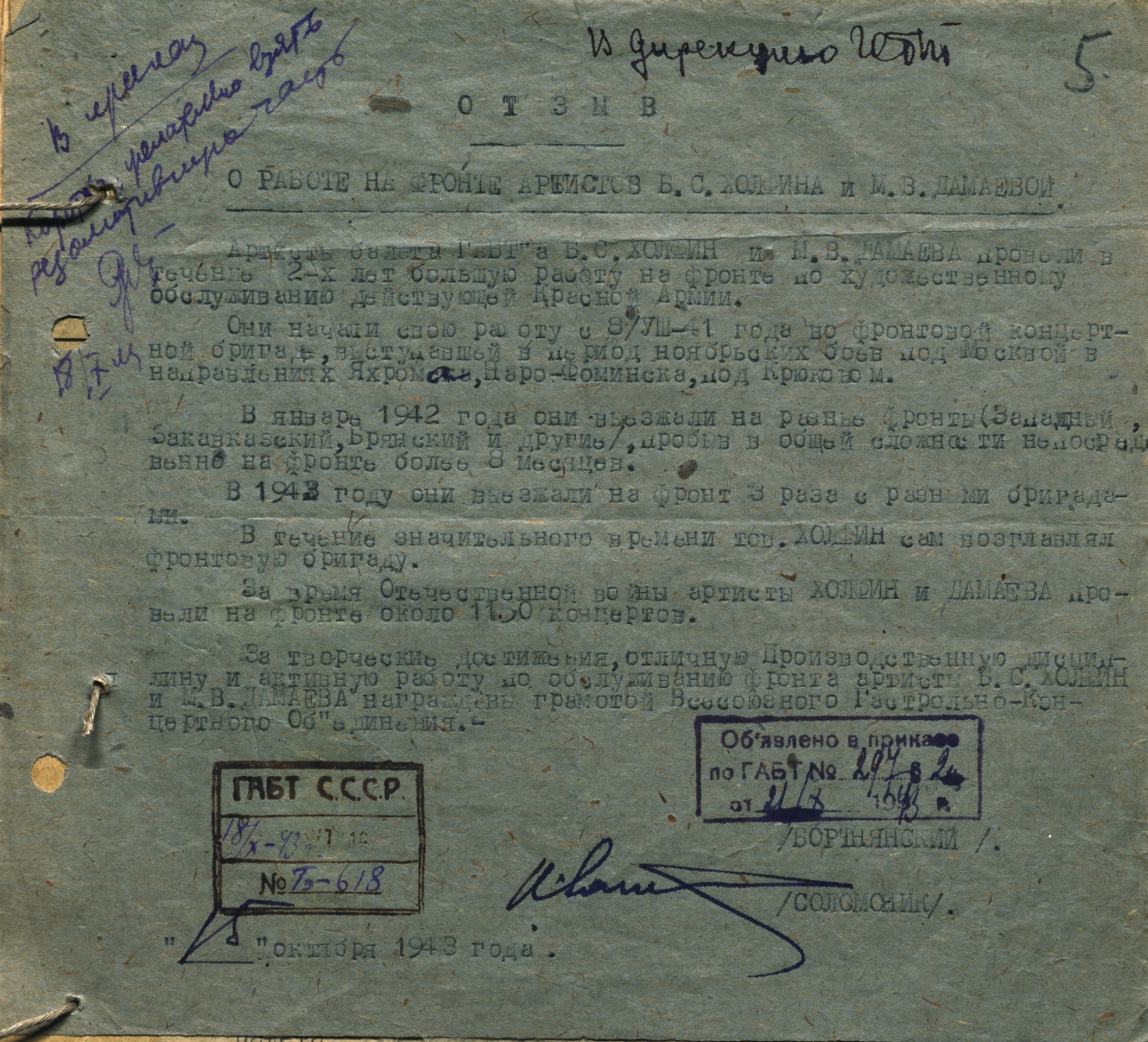 Справка о работе Б.С. Холфина и М.В. Дамаевой в составе фронтовых бригадах 1941-1943 гг. 18 октября 1943 г. Машинопись. Ф. 648. Оп. 13. Ед. хр. 196. Л. 5