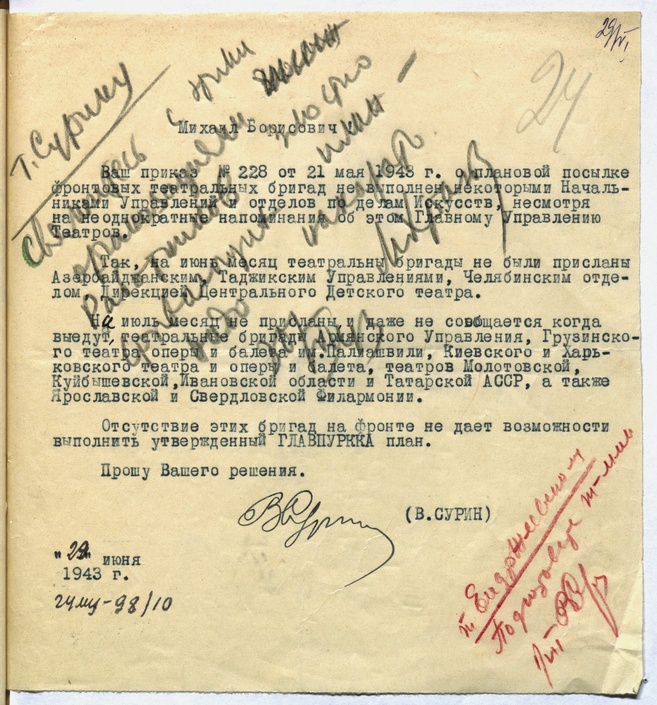Письмо начальнику Главного управления музыкальными учреждениями КПДИ при СНК СССР В.Н. Сурина М.Б. Храпченко о срыве некоторыми региональными управлениями по делам искусств сроков отправки театральных бригад. 29 июня 1943 г. (Резолюция Б.М. Храпченко В.Н. Сурину от 30 июля 1943 г.: «Свяжитесь с этими организациями. Работников, злостно срывающих план – надо наказать» ). Машинопись. Ф. 962. Оп. 5. Ед. хр. 692. Л. 24