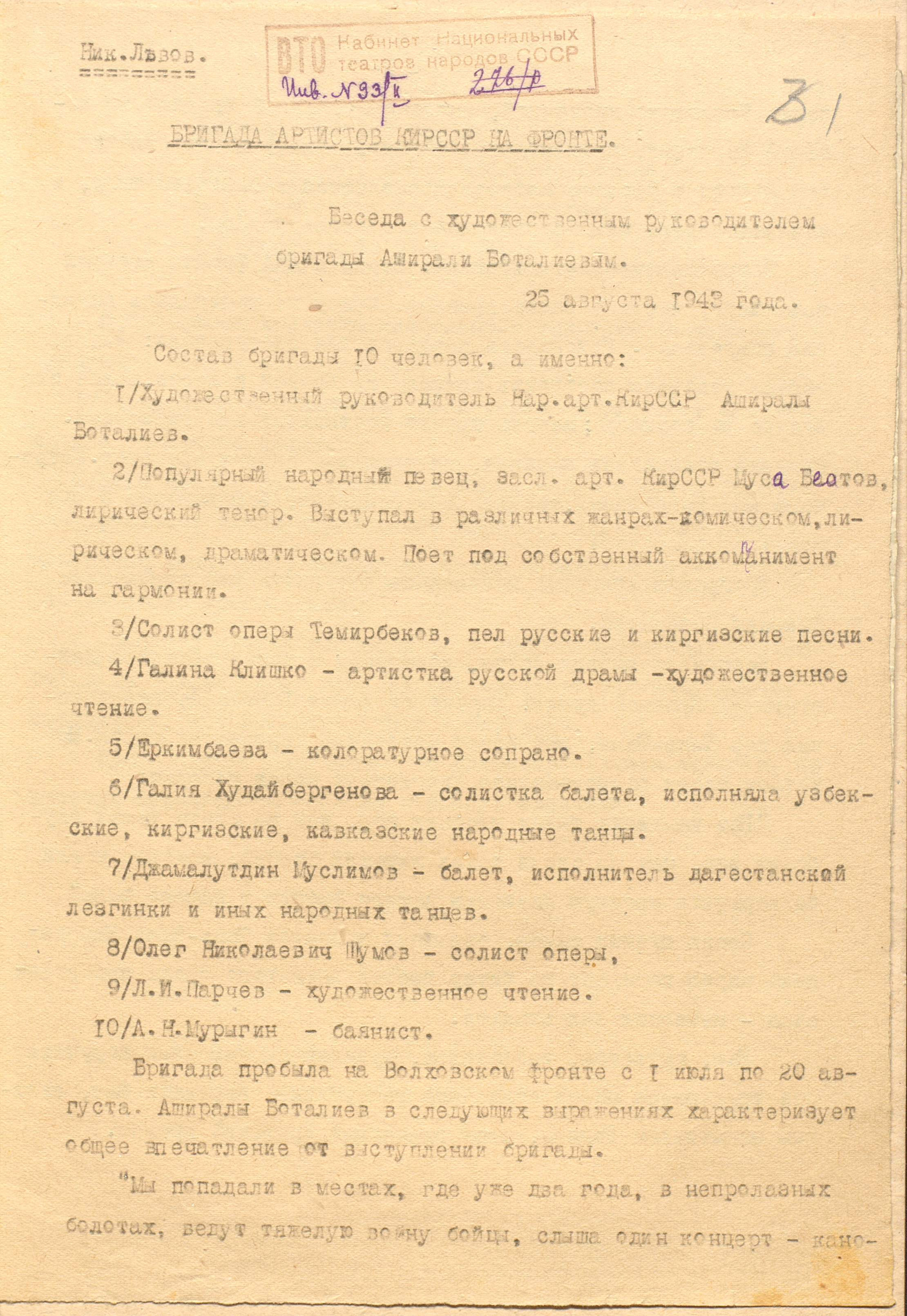 Запись беседы с художественным руководителем фронтовой концертной бригады Киргизской ССР, народным артистом Киргизской ССР Аширалы Боталиевым о работе на фронте. 25 августа 1943 г. Машинопись. Ф. 970. Оп. 17. Ед. хр. 62. Л. 1-2