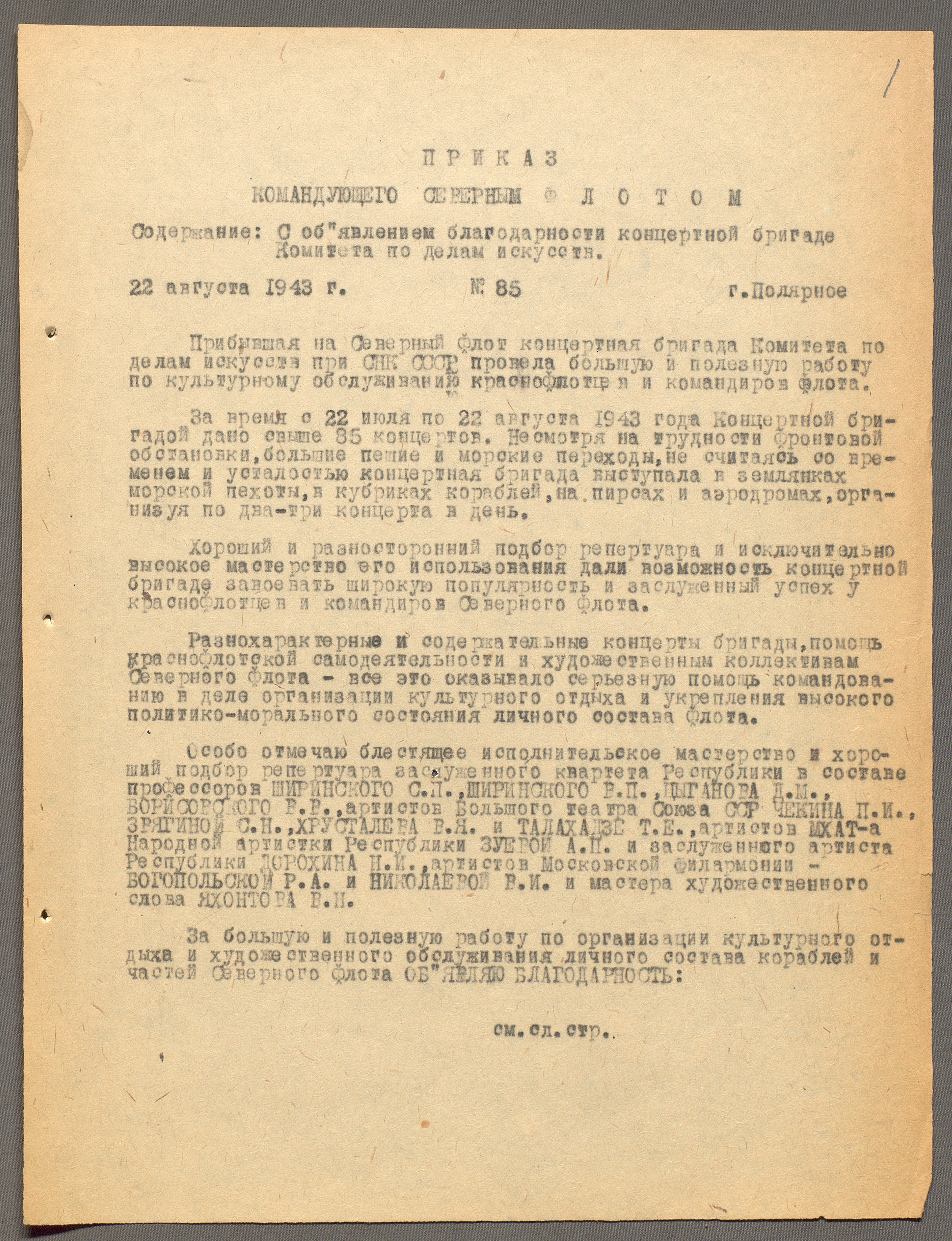 Приказ командующего Северным флотом вице-адмирала А.Г. Головко № 85 с объявлением благодарности концертной бригаде КПДИ при СНК СССР с участием С.П. Ширинского, В.П. Ширинского, В.В. Борисовского, Д.М. Цыганова, А.П. Зуевой, Т.Е. Талахадзе и др. 22 августа 1943 г. Машинописная копия. Ф. 2922. Оп. 3. Ед. хр. 11. Л. 1-2