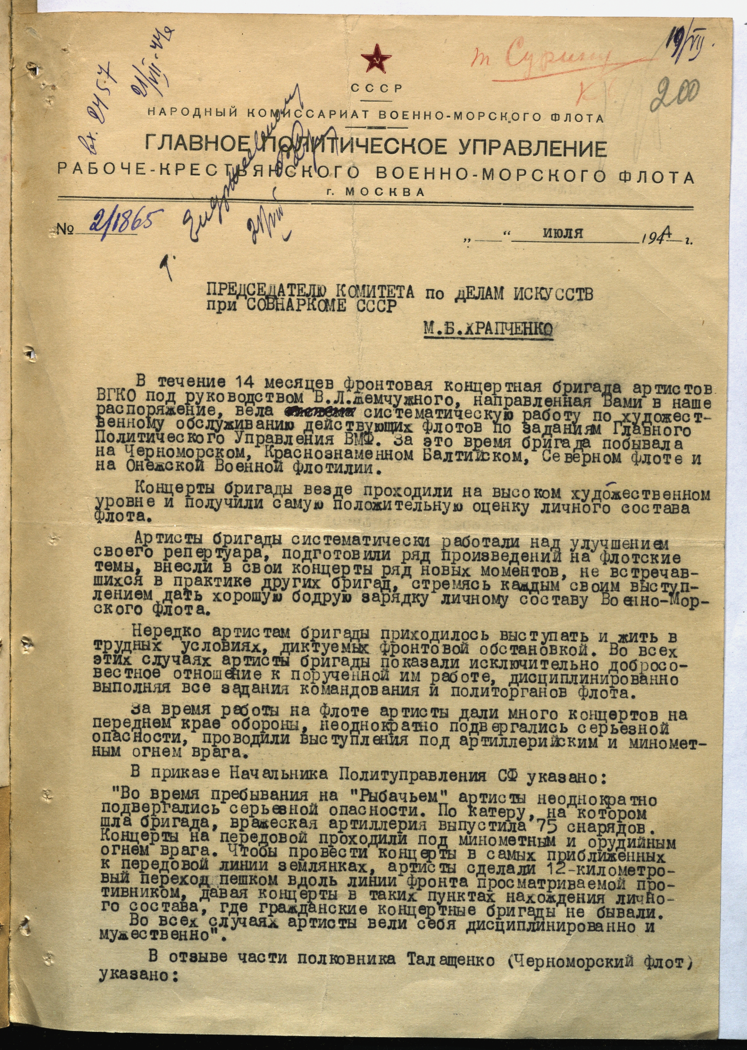 Письмо начальника 4-го отдела Главного политуправления военно-морского флота полковника Портова М.Б. Храпченко о командировании для обслуживания частей ВМФ СССР концертных бригад, в том числе джаз-ансамблей под руководством Л.О. Утесова и К.И. Шульженко. 2 июля 1943 г. Машинопись. Ф. 962. Оп. 3. Ед. хр. 1172. Л. 16