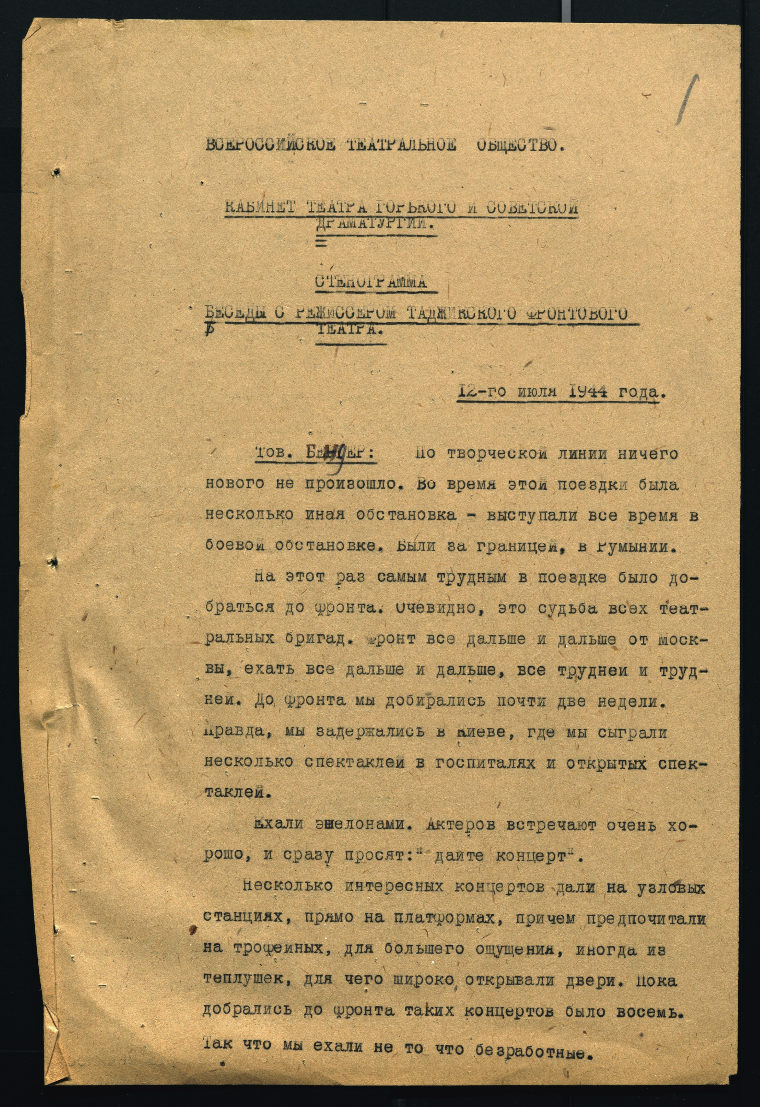 Стенограмма беседы в Всероссийском театральном обществе с режиссером Таджикского фронтового театра Н.А. Бондарем о поездке на I-й Украинский фронт. 12 июля 1944 г. Машинопись. Ф. 970 оп.10 ед. хр.134. Л. 1-7об