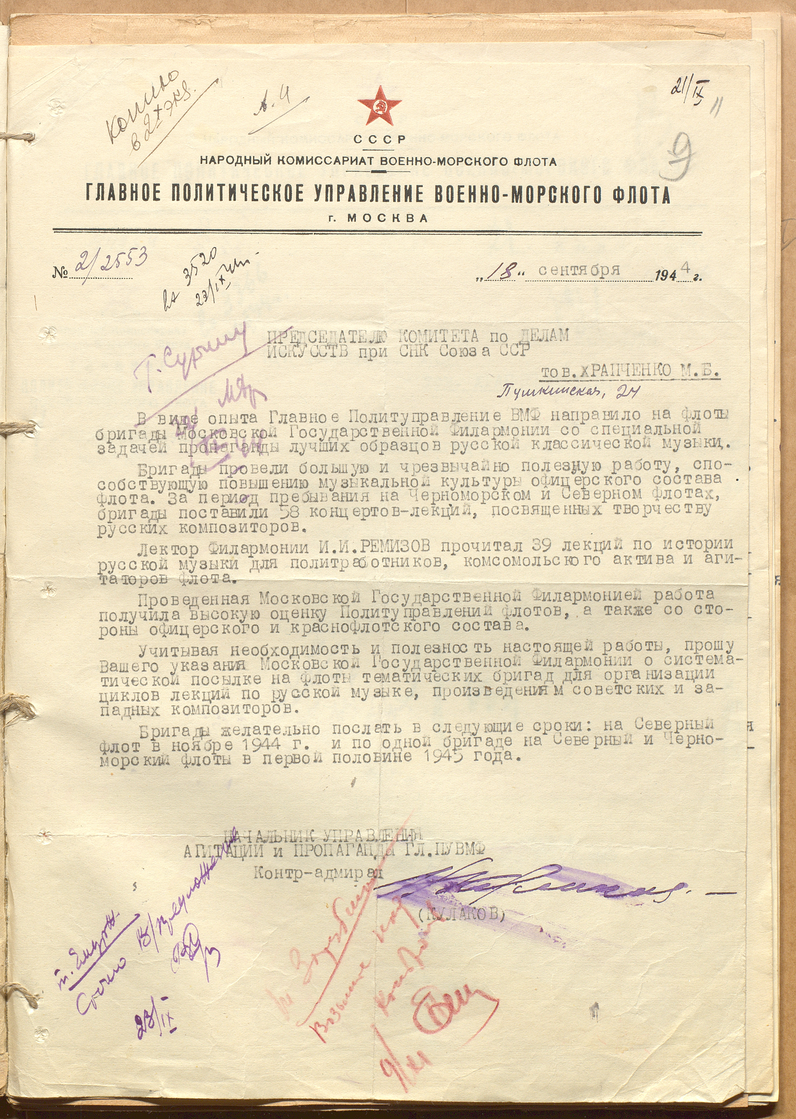 Письмо начальника Управления агитации и пропаганды Главного политуправления ВМФ СССР контр-адмирала Н.М. Кулакова М.Б. Храпченко о направлении на Черноморский и Северный флоты тематических бригады Московской государственной филармонии для организации лекций по русской музыке. 18 сентября 1944 г. Машинопись. Ф. 962. Оп. 5. Ед. хр. 779. Л. 11
