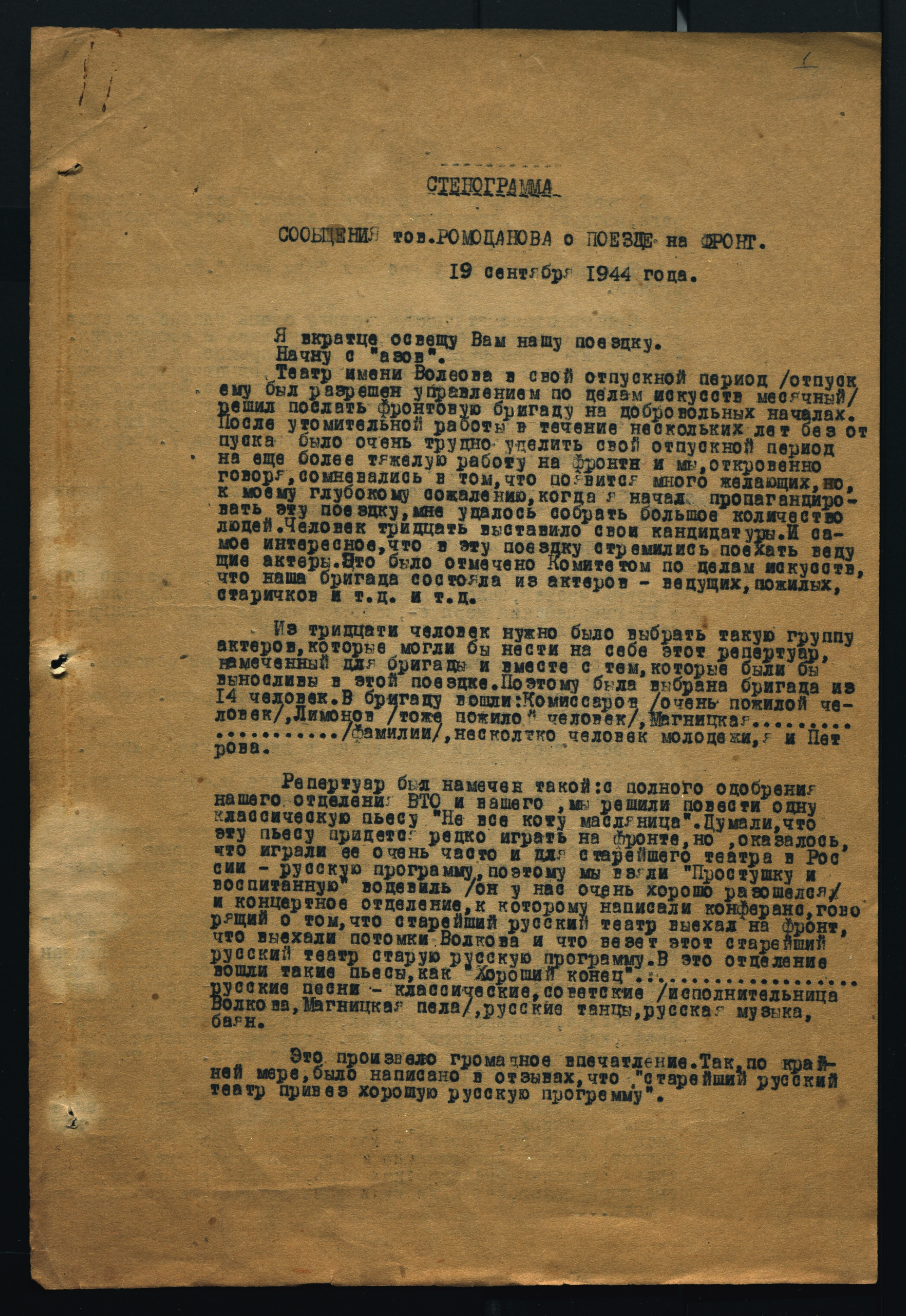 Стенограмма выступления в Всероссийском театральном обществе участника фронтовой бригады Волковского театра С.Д. Ромоданова о поездке на фронт. 19 сентября 1944 г. Машинопись. Ф. 970. Оп. 10. Ед. хр. 141. Л. 1-13