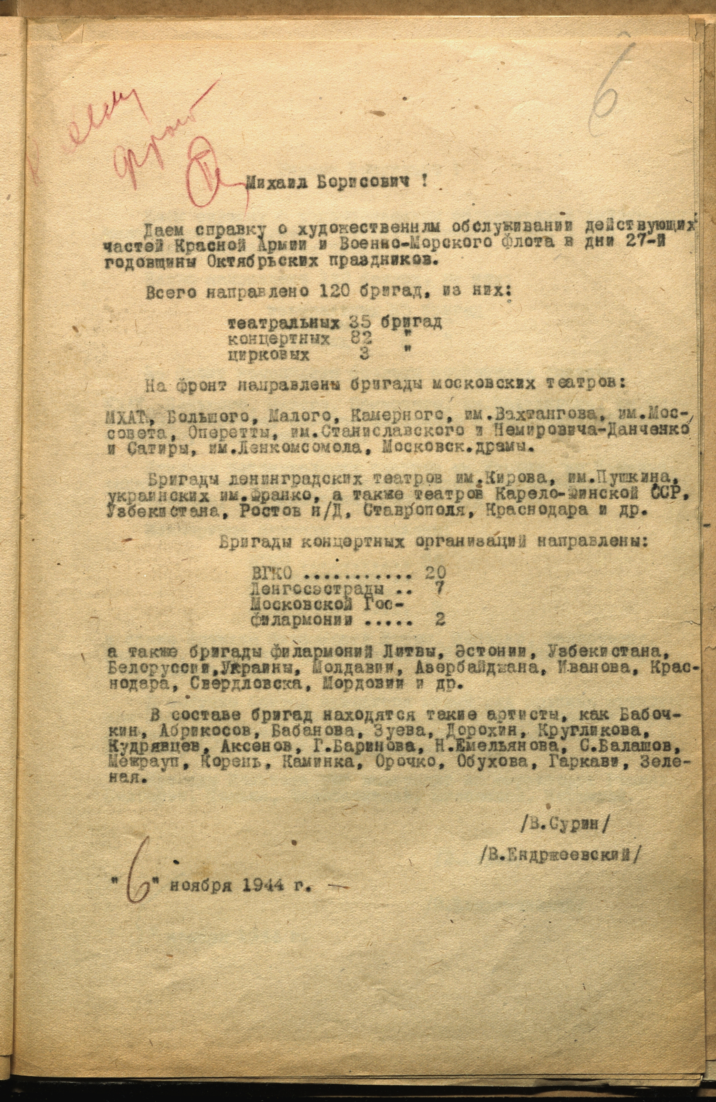 Справка о количестве и составе фронтовых бригад, занятых в обслуживании частей Красной армии и Военно-морского флота в дни 27-й годовщины Октябрьской революции 1917 г. 6 ноября 1944 г. Машинопись. Ф. 962. Оп. 5. Ед. хр. 692. Л. 6