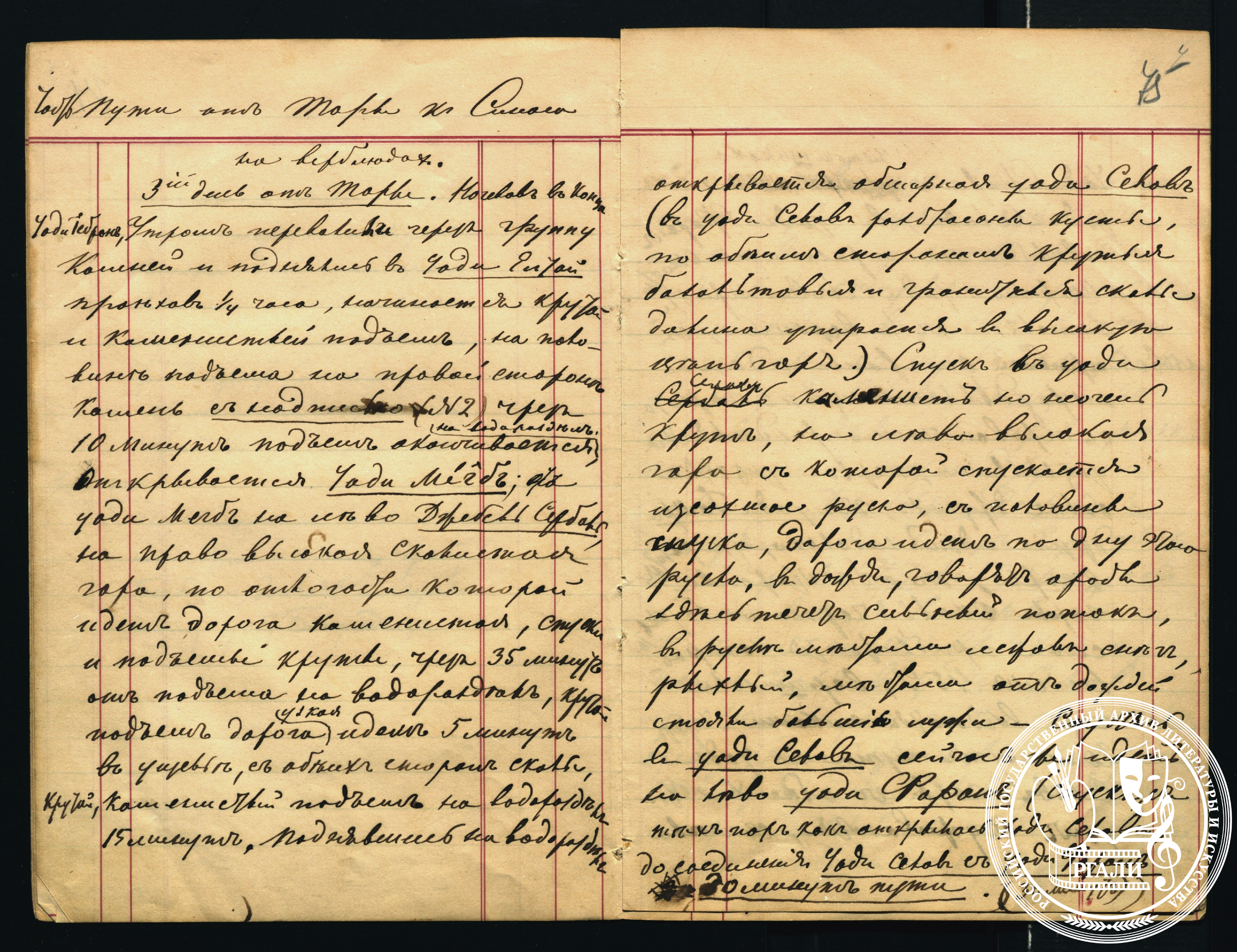 Материалы путешествий А.С. Норова также представлены в РГАЛИ. Среди них самыми объемными являются разрозненные путевые записи о посещении Палестины и Синая, где Авраам Сергеевич довольно полно фиксирует свои передвижения и впечатления (Ф. 349. Оп. 1. Ед. хр. 39). Интерес вызывает и небольшое собрание документов, полученных или купленных Норовым во время его пребывания на Востоке (Ф. 349 Оп. 1 Ед. хр. 6): копия охранной грамоты, выданной Наполеоном Синайскому монастырю, список странноприимных домов в Сирии и Палестине и других, свидетельствующих о глубоком и тщательном подходе к исследованию истории и географии стран пребывания.