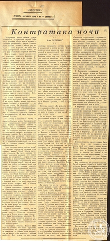 На Нюрнбергском процессе Илья Эренбург пробыл недолго и посвятил ему три больших очерка: первый, «Мораль истории», вышел в «Правде» 1 декабря 1945-го, вторым был уже процитированный «Час ответа», третий, «Контратака ночи», напечатали 30 марта 1946 года «Известия». В последнем Эренбург поднимал важнейшую тему возможной реставрации фашизма, страшного «контрнаступления смерти». «Меньше года назад, — писал он, — когда Красная Армия шла к Берлину, еще лилась кровь России». «Не высохли те слезы, не заросли те могилы! А уже скверные шептуны нашептывают. А уже клеветники клевещут. А уже Геринг ищет последователей, приверженцев, продолжателей» – предупреждал он. Говоря о значении Нюрнбергского процесса Эренбург пророчески писал: «…Он должен вгрызться в память забывчивых, предостеречь от повторения прошлого; обвинители не архивариусы, это люди, которые защищают будущее».