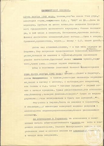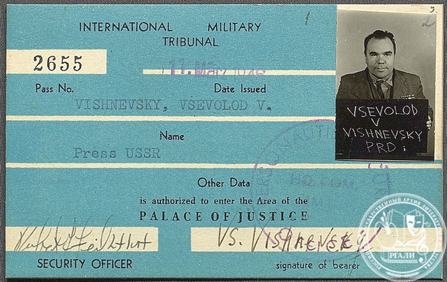 Человек исключительной энергии и работоспособности, Всеволод Вишневский, вероятно, стал главным советским трибуном на Нюрнбергском процессе, написав о нем более двадцати очерков. Большая часть из них – как в виде рукописей, так и в виде вырезок из газет – сохранилась в его личном фонде № 1038 в РГАЛИ. Первая его корреспонденция «На процессе в Нюрнберге» была опубликована в «Правде» через несколько дней после первого заседания, 26 ноября 1945 года. «Пишу быстро, с подъемом», – отмечал Вишневский в дневнике в тот же день.