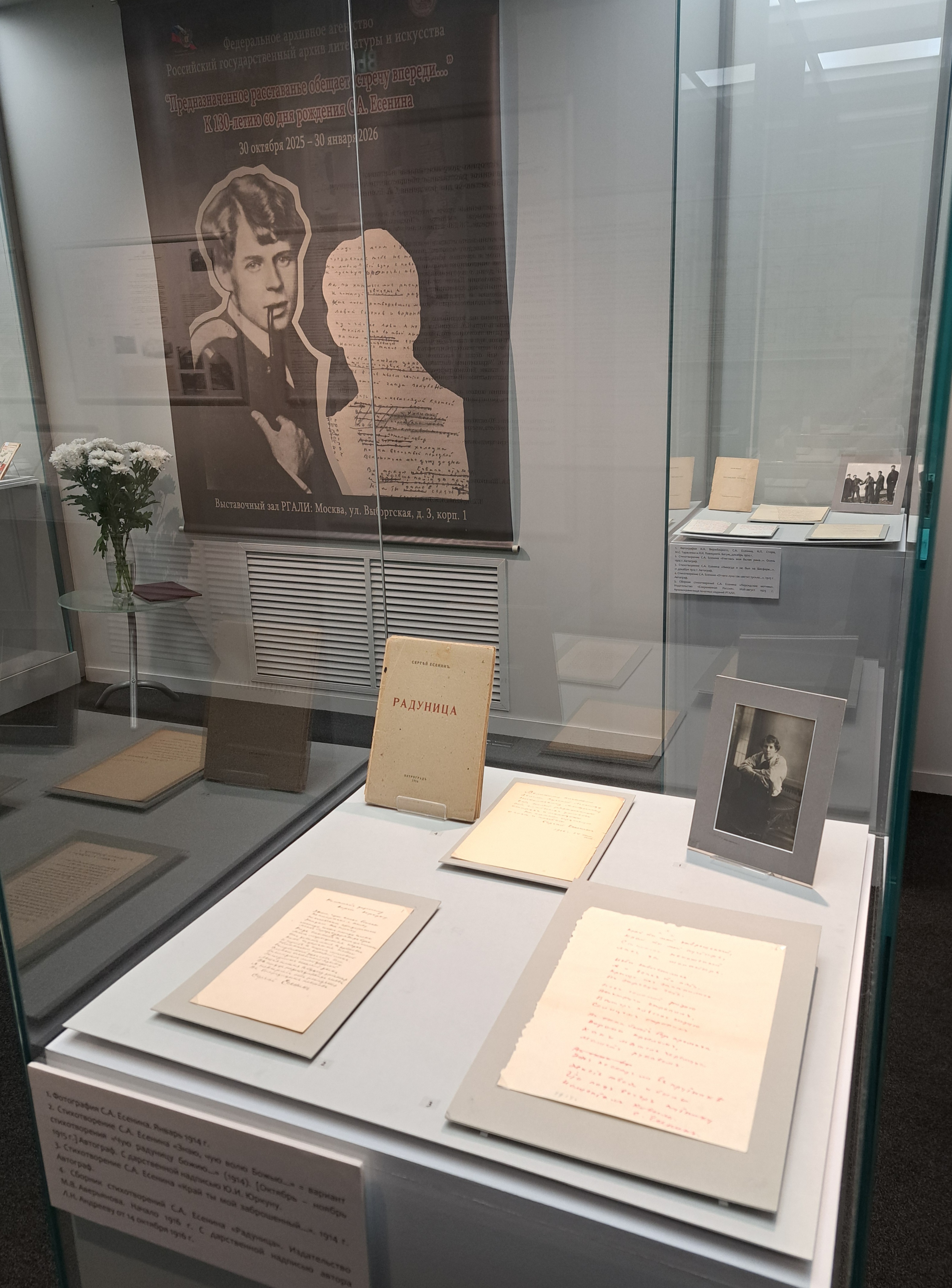 Личный фонд С.А. Есенина в РГАЛИ представляет собой одно из крупнейших и уникальных по своей полноте собраний документов поэта в России, и насчитывает более 450 единиц хранения – значительная их часть вошла в состав экспозиции. В выставочных витринах представлено около 200 документов из фондов РГАЛИ – рукописи, письма, фотографии, афиши, живопись и графика ХХ века. Выставка освещает путь С.А. Есенина в литературе, отразив эволюцию его духовных и эстетических поисков, смену настроений, мотивов, муз и главных тем. Положенные в ее основу документы позволяют в полной мере реконструировать личную и творческую биографию Сергея Есенина, чей образ в массовом сознании в значительной мере мифологизирован. Украшением выставки стали автографы его основных произведений, а также библиографические редкости — сборники поэта, выпущенные издательством «Имажинисты».