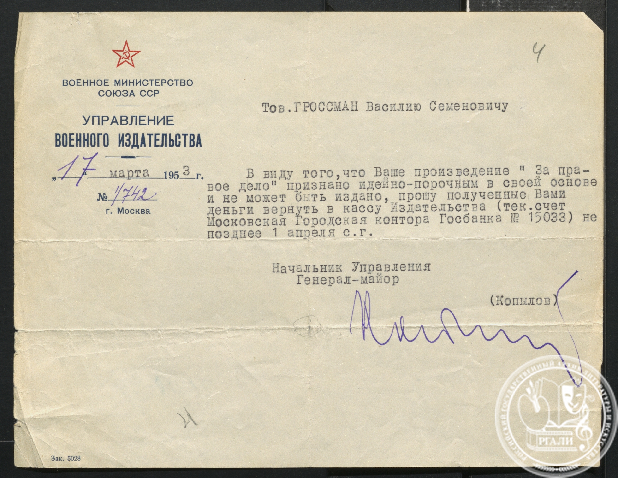 Одна из описей фонда, четвертая, включает в себя рукопись романа «Жизнь и судьба», в 1961 году изъятую КГБ и полученную РГАЛИ 25 июля 2013 года от Центрального архива ФСБ России.