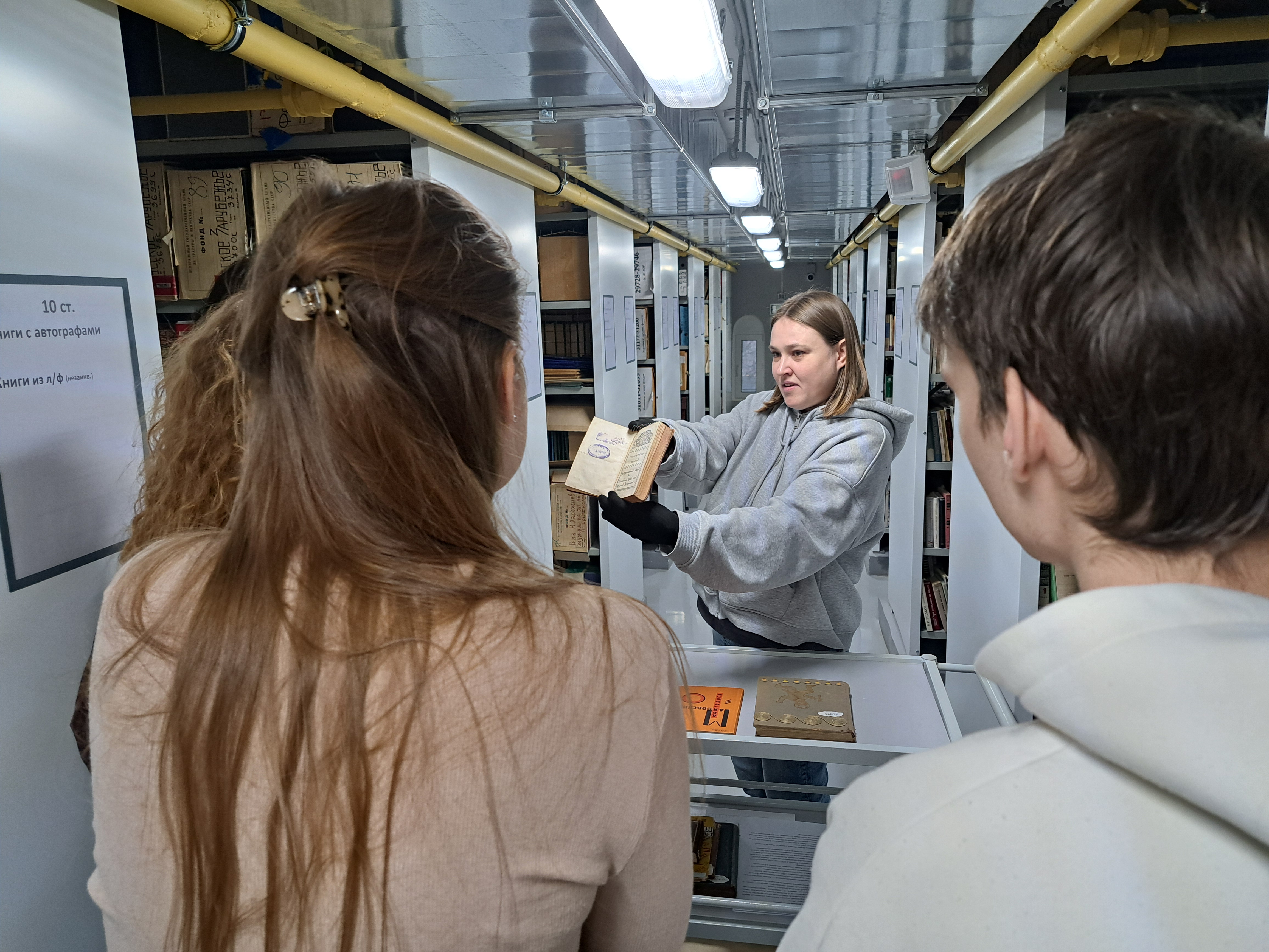 В хранилище печатных изданий студентам рассказали о составе коллекций архивохранилища и познакомили с некоторыми интересными книжными экземплярами — грамматикой начала XVIII века, примерами книжного авангарда, изданиями из личных собраний фондообразователей архива, такими как том рассказов А.М. Ремизова с его автографом на глаголице. Затем бакалавры познакомились с традиционным каталогом РГАЛИ.