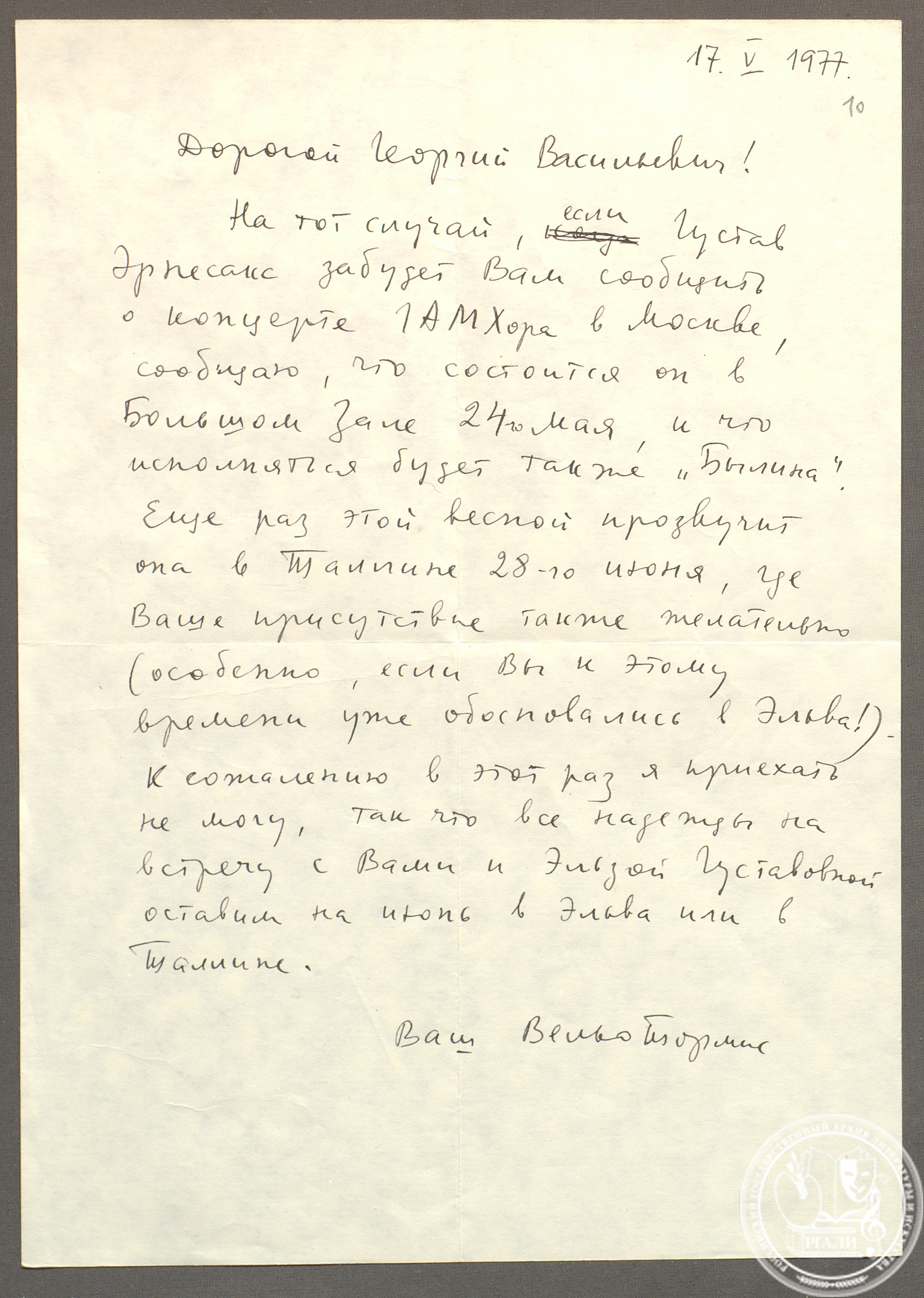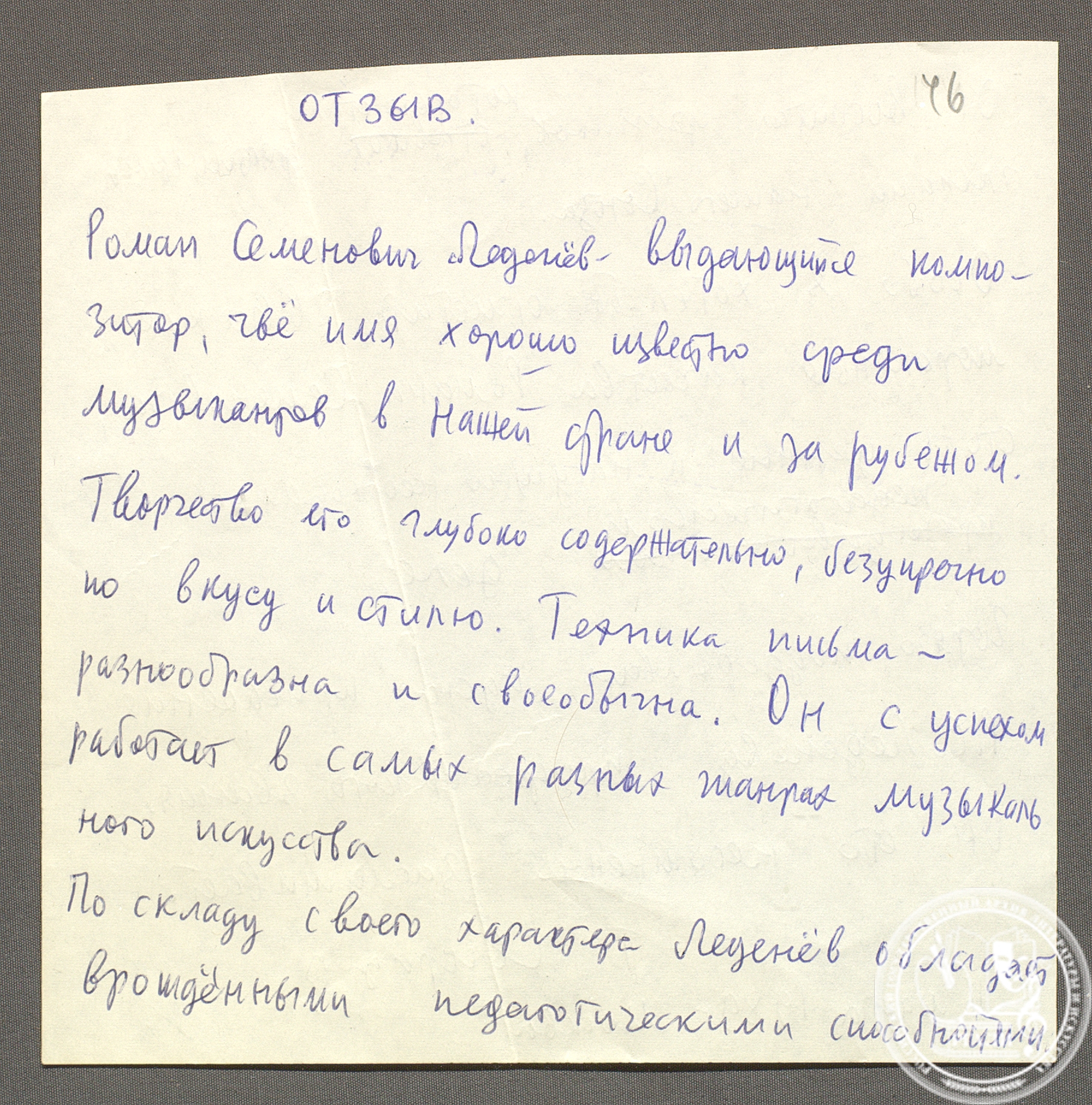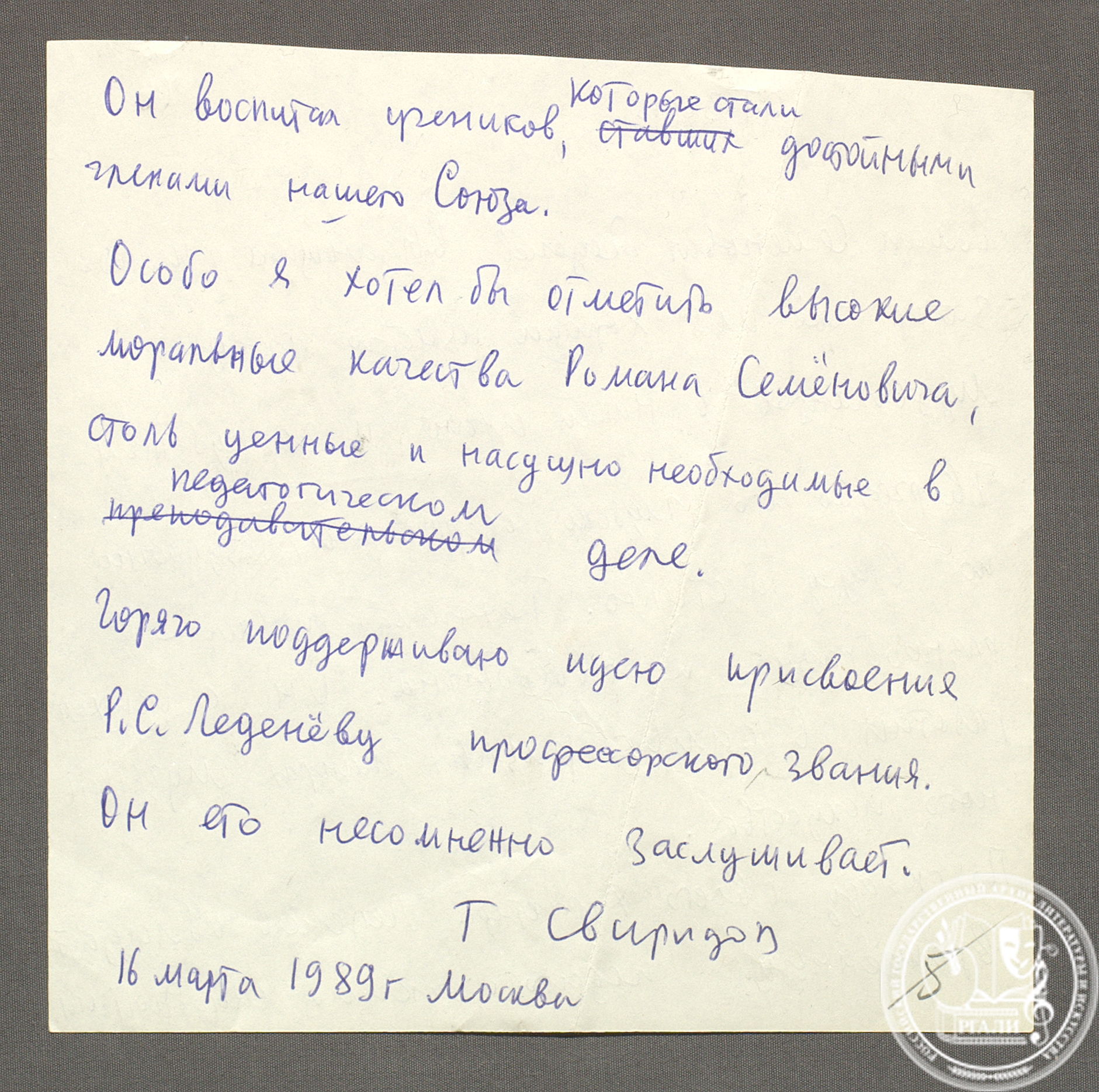 Многогранность и многомерность представленных в РГАЛИ документов, связанных с Г.В. Свиридовым, подтверждает огромное значение его творческой и общественной деятельности для отечественной культуры.