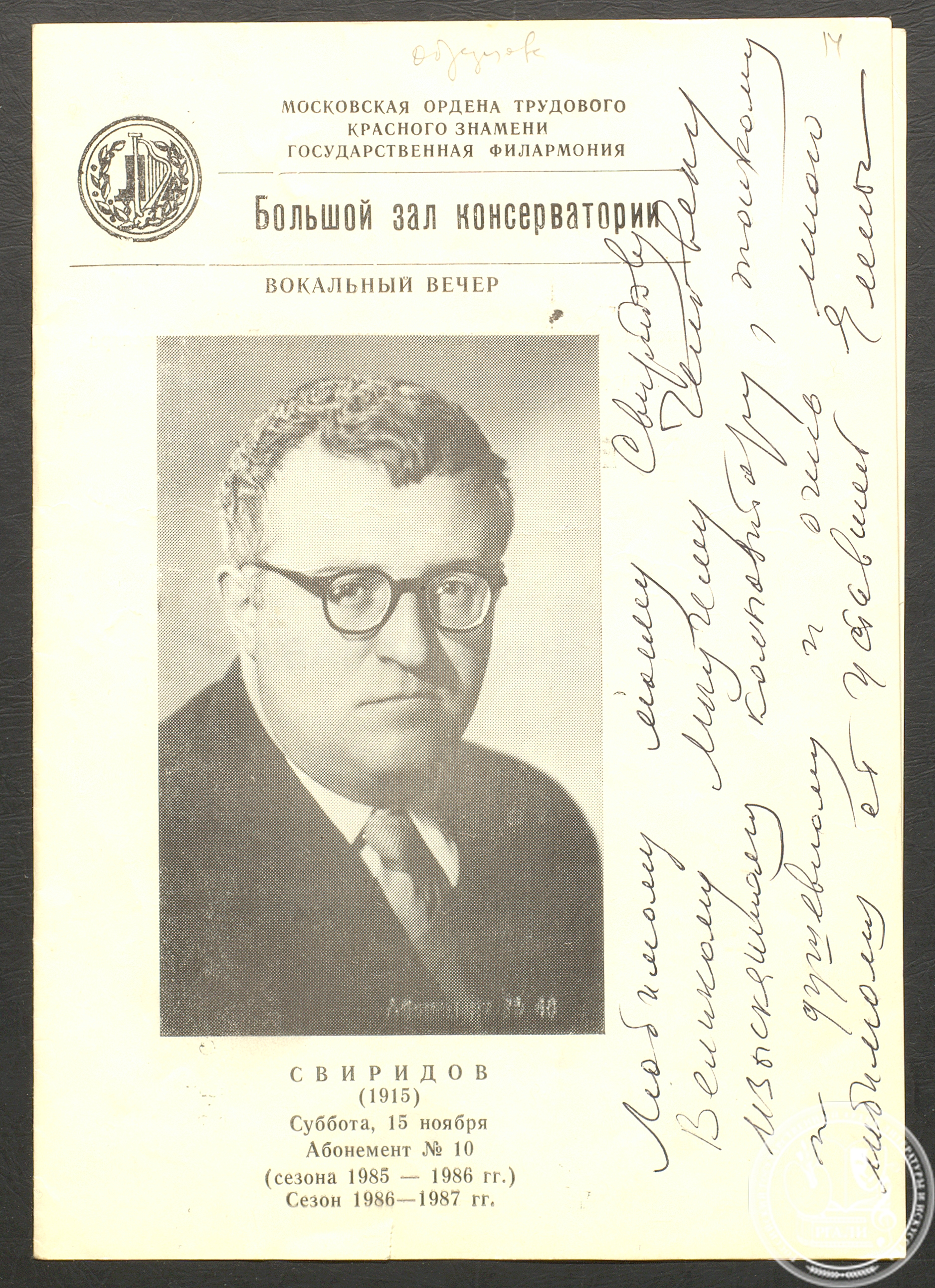 Примерно тот же список имен можно назвать, говоря о фотографиях, хранящихся в фонде Г.В. Свиридова, количество которых чрезвычайно велико. Также в его архиве представлено большое число концертных программ и афиш, которые свидетельствуют об исполнении музыкальных произведений композитора.