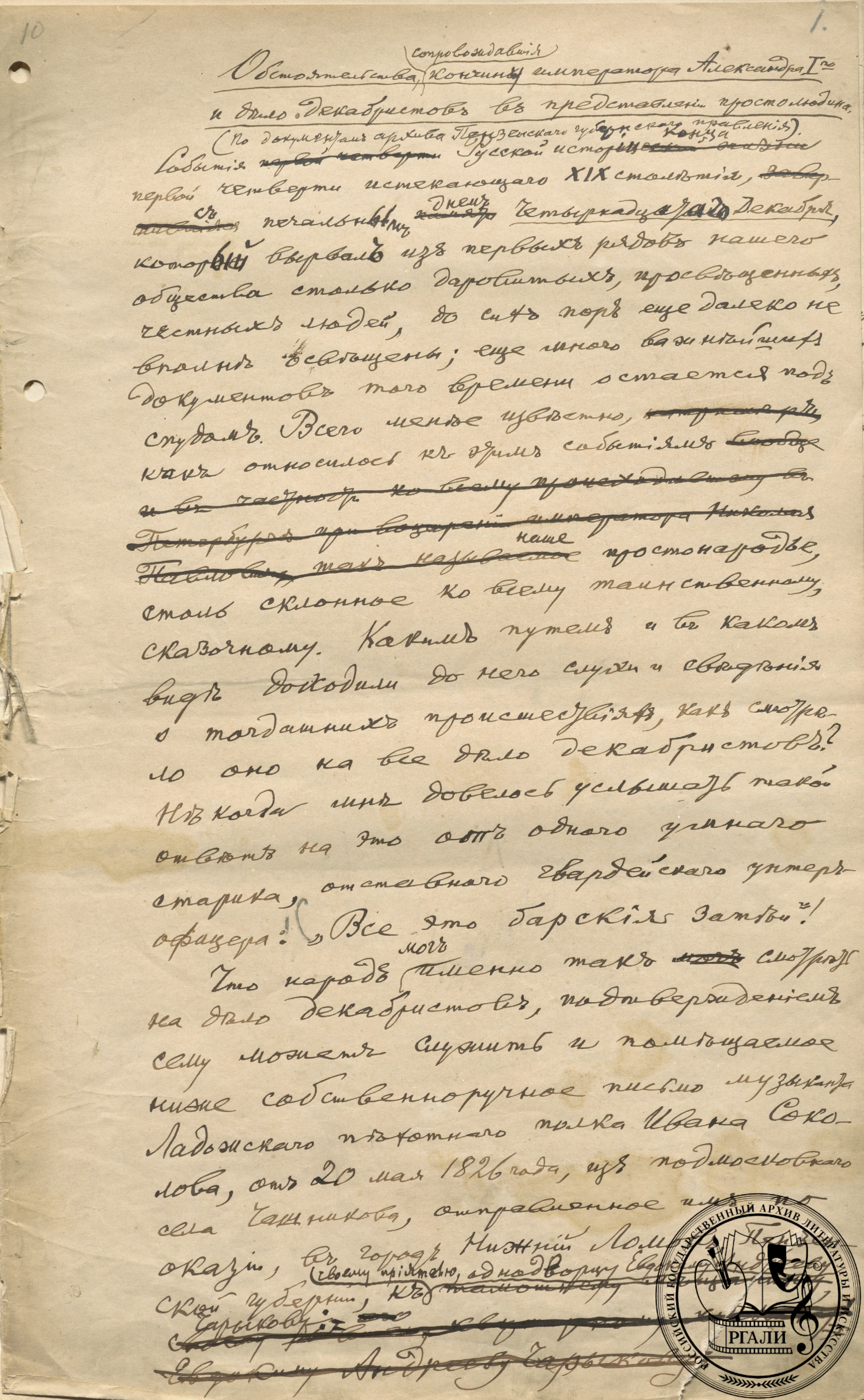 Пример подобного фольклора запечатлен в записях историка Александра Платоновича Барсукова, чей фонд хранится в РГАЛИ. В автографе «Обстоятельства, сопровождавшие кончину императора Александра I-го и дело декабристов в представлении простолюдина (по документам архива Пензенского губернского правления)» Александр Платонович воспроизвел собственноручное письмо музыканта Ладожского пехотного полка Ивана Соколова от 20 мая 1826 года, из подмосковного села Чашникова, отправленное им по оказии в город Нижний Ломов, Пензенской губернии своему приятелю − однодворцу Евдокиму Андрееву Чарыкову. В письме Соколов делится «подлинными подробностями» кончины императора Александра Павловича, а также рассказывает о якобы готовившихся покушениях на августейшую фамилию.