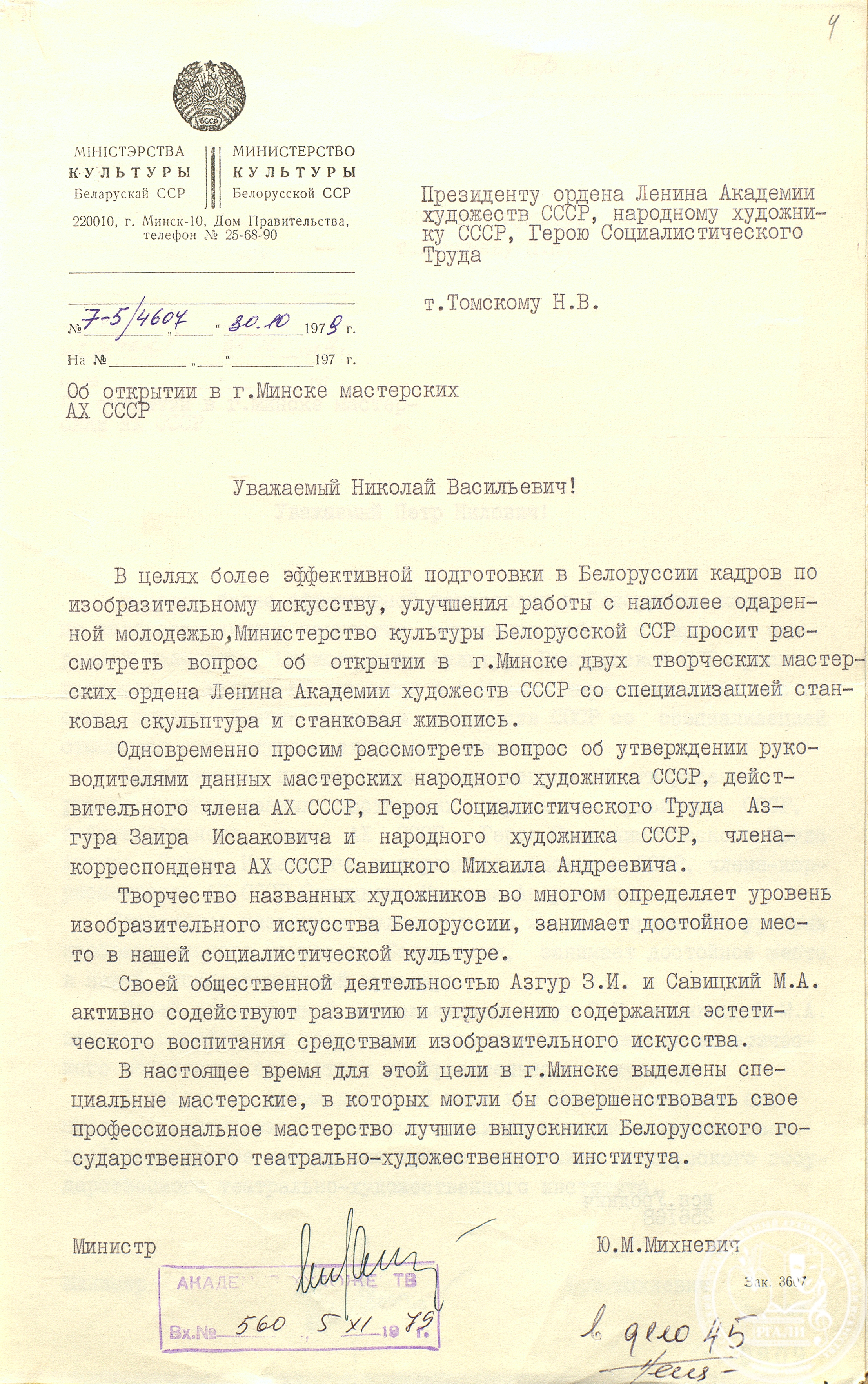 Для экспозиции архив передал копии 3 документов, связанных с деятельностью М.А. Савицкого в должности руководителя творческой мастерской Академии художеств СССР в Минске, из фондов Комитета по делам искусств при Совете министров СССР (Ф. 962) и Академии художеств СССР (Ф. 3355).