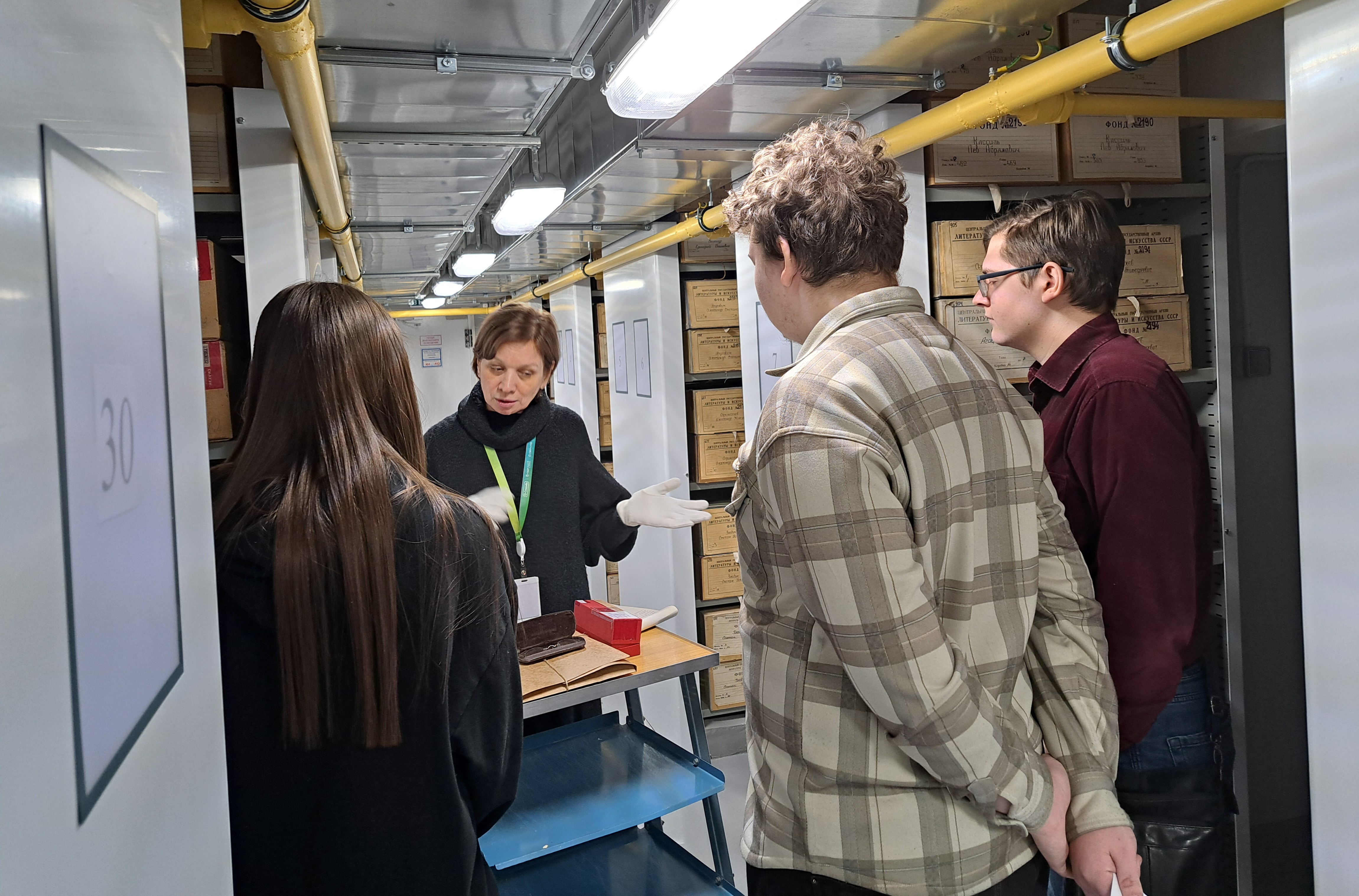 Начальник отдела Н.Ю. Ельцова рассказала об истории создания и структуре архива, целях, задачах и основных направлениях деятельности РГАЛИ. Затем будущим историкам представилась возможность увидеть подлинные документы архивного собрания из личных фондов А.П. Чехова, М.Ю. Лермонтова, С.А. Есенина, Н.С. Гумилева, Н.Ф. Брюллова, В.В. Верещагина и др.