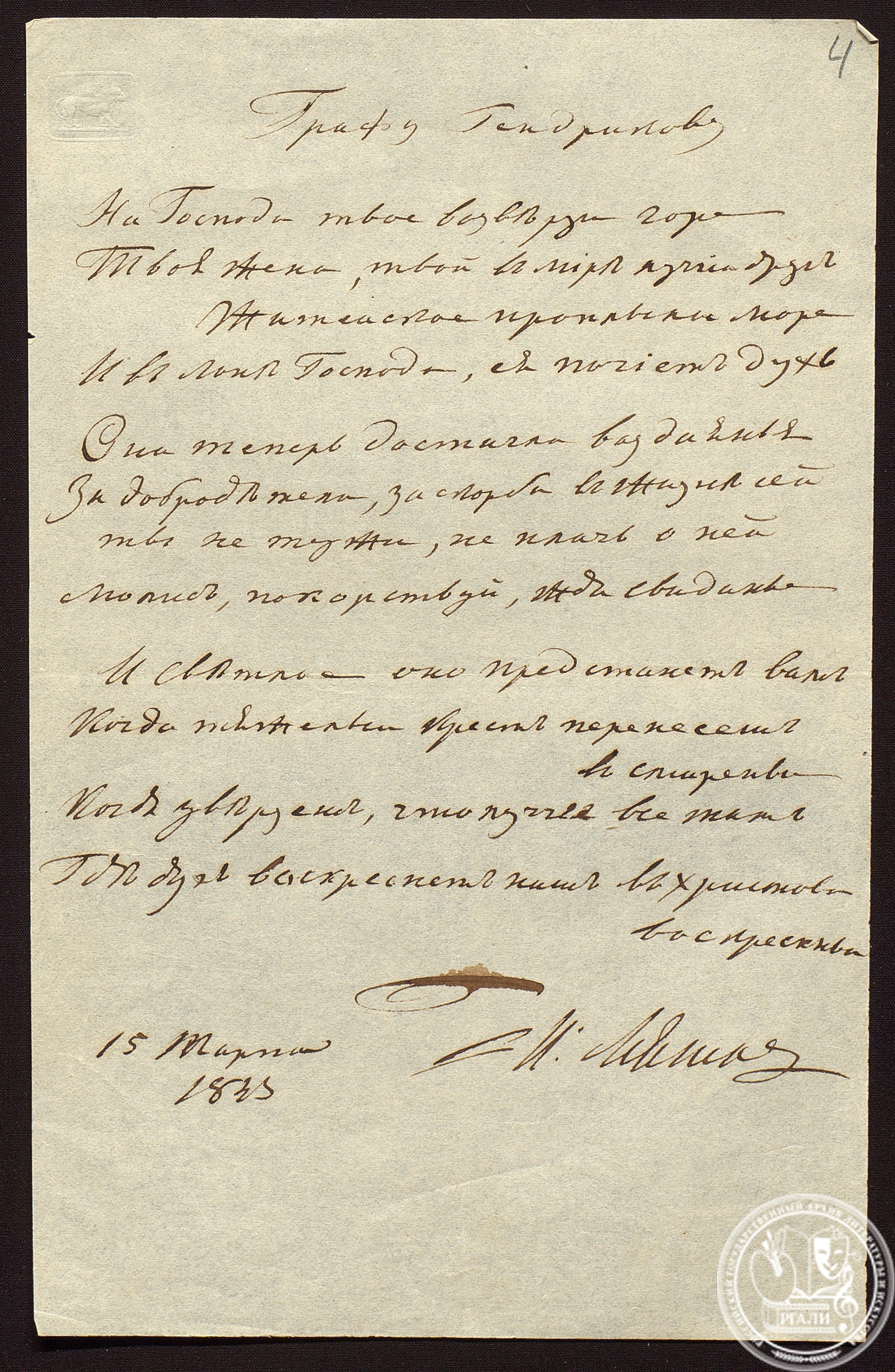 Небольшая переписка поэта представлена его письмами дипломату П.И. Кривцову и письмо к Мятлеву И.А. Крылова.