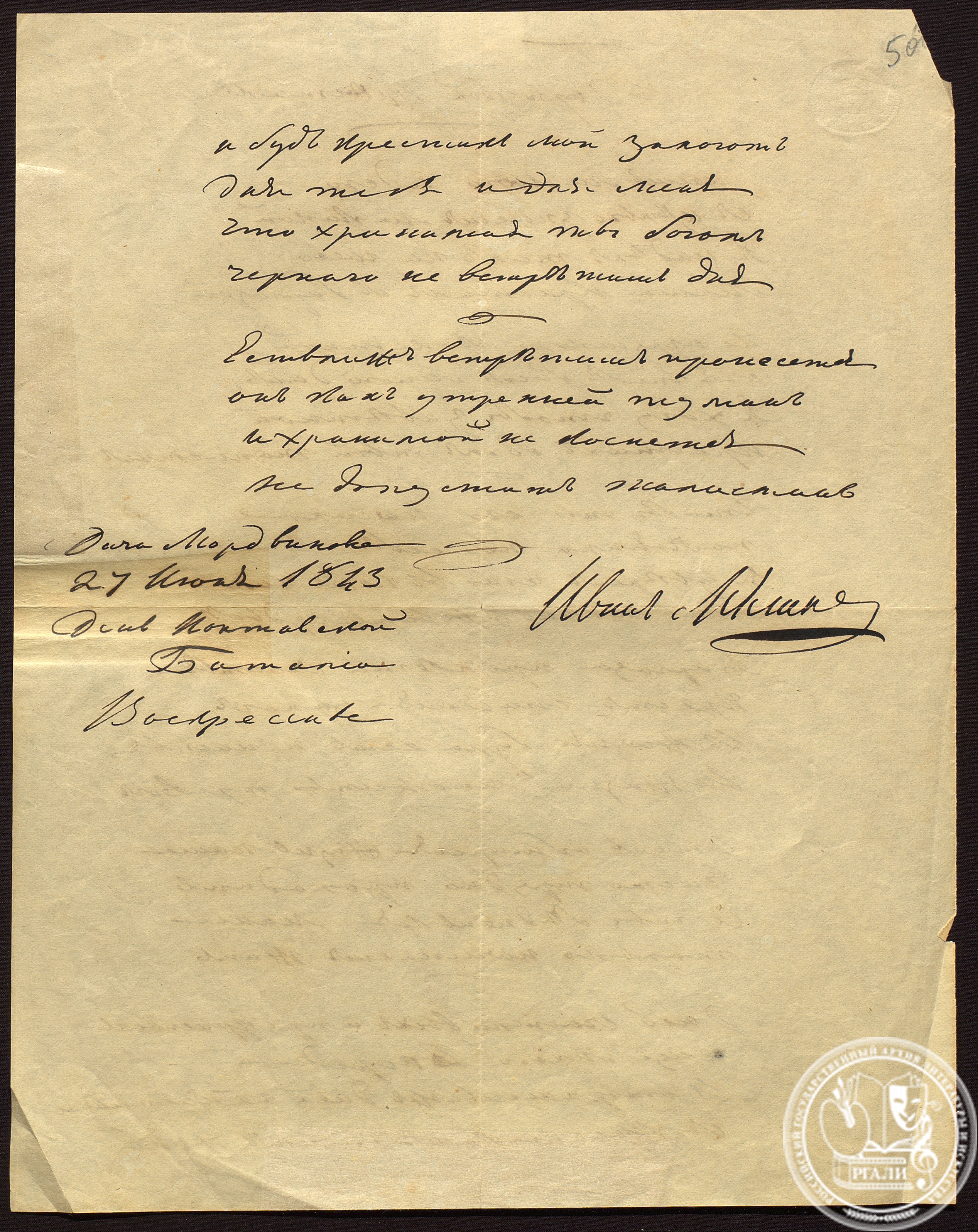 В РГАЛИ благодаря собирательской деятельности сотрудников Гослитмузея, буквально спасавших в 1930-е годы остатки дворянских архивов, хранится личный фонд И.П. Мятлева (№ 333, 36 дел за 1831–1915 годы), в котором находятся документы представителей трех поколений семьи Мятлевых.