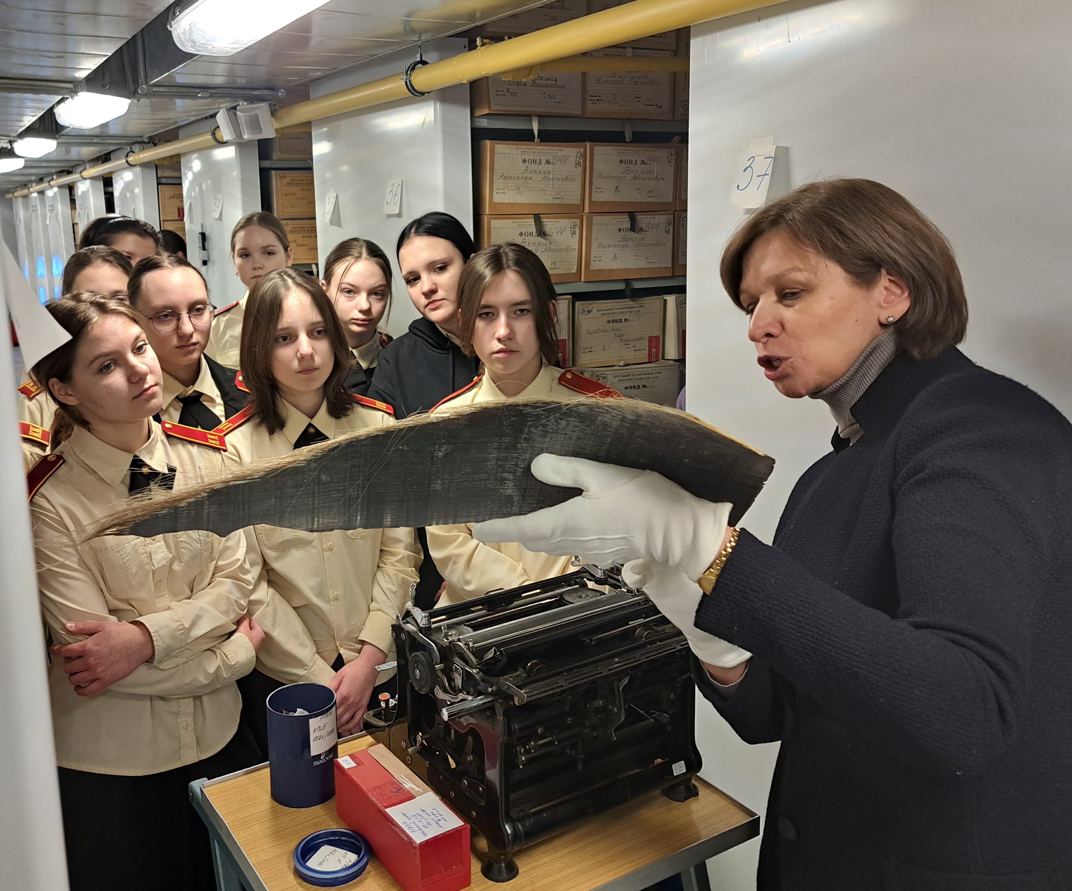 В архивохранилище личных фондов главный специалист Г.И. Терехова показала мемориальные предметы, хранящиеся в РГАЛИ, среди которых перьевая ручка М.И. Цветаевой, печатная машинка К.М. Симонова и хлопушку со съемок фильма А.В. Баталова «Три толстяка».