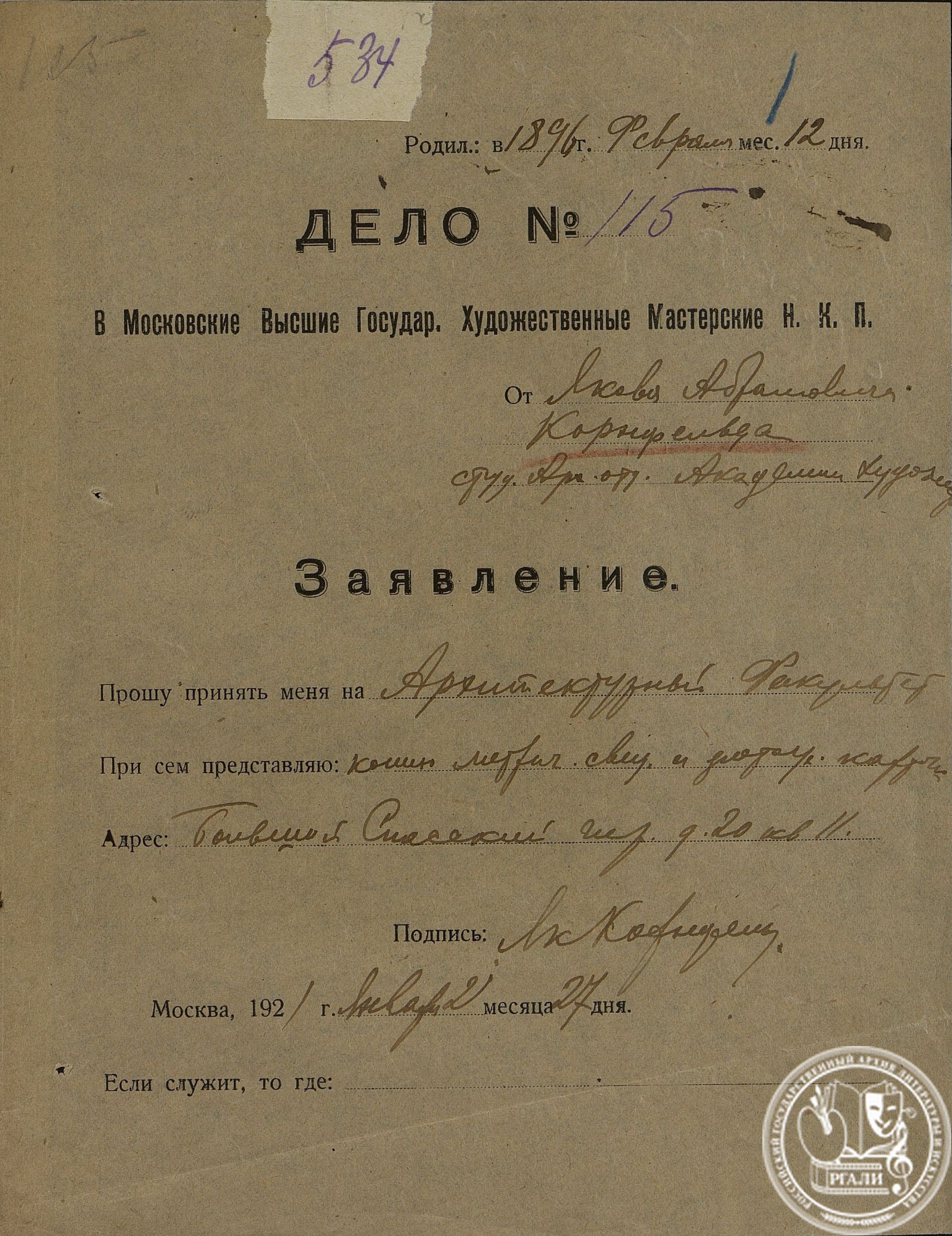 В заметке с говорящим названием «Полнота жизни», опубликованной Яковом Абрамовичем Корнфельдом в 1938 году в «Архитектурной газете», он сам описал свое становление как архитектора и преподавателя: «В тринадцать лет я, как и многие еврейские мальчики, выбрал Киевское художественное училище только потому, что туда принимали евреев без ограничения процентной нормой. В годы учения я полюбил искусство. Захватили горячие мечты о далекой и недоступной Академии. Учебу в Академии вскоре прервала война, сначала империалистическая, потом гражданская. Лишь через пять лет я ‒ в стенах ВХУТЕМАС. В бурных дискуссиях, в горячем до самозабвения труде вовлекались мы в новую жизнь, становились ее строителями. Еще до окончания школы мне поручают строить павильон Русгерторга на выставке 1923 г., жилые и административные дома Моссукно. Работа ширится вместе с расцветом страны. Строю электроцентрали, фабрику, типографию, клубы, дворцы культуры, кино» (РГАЛИ, Ф. 3321. Оп. 1). Так писал о себе уже состоявшийся мастер ‒ член-корреспондент Академии архитектуры СССР.