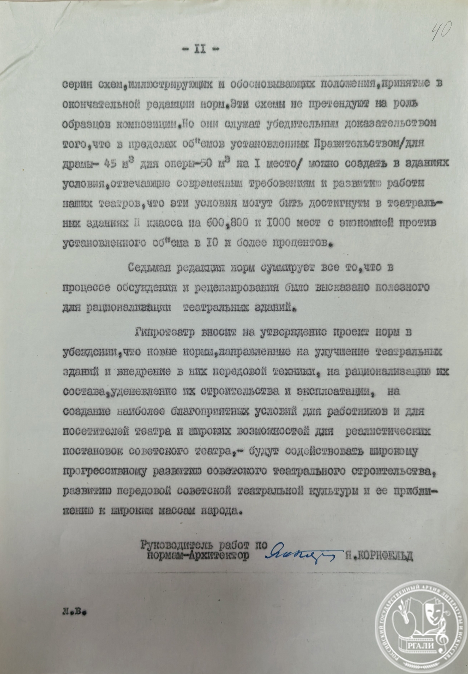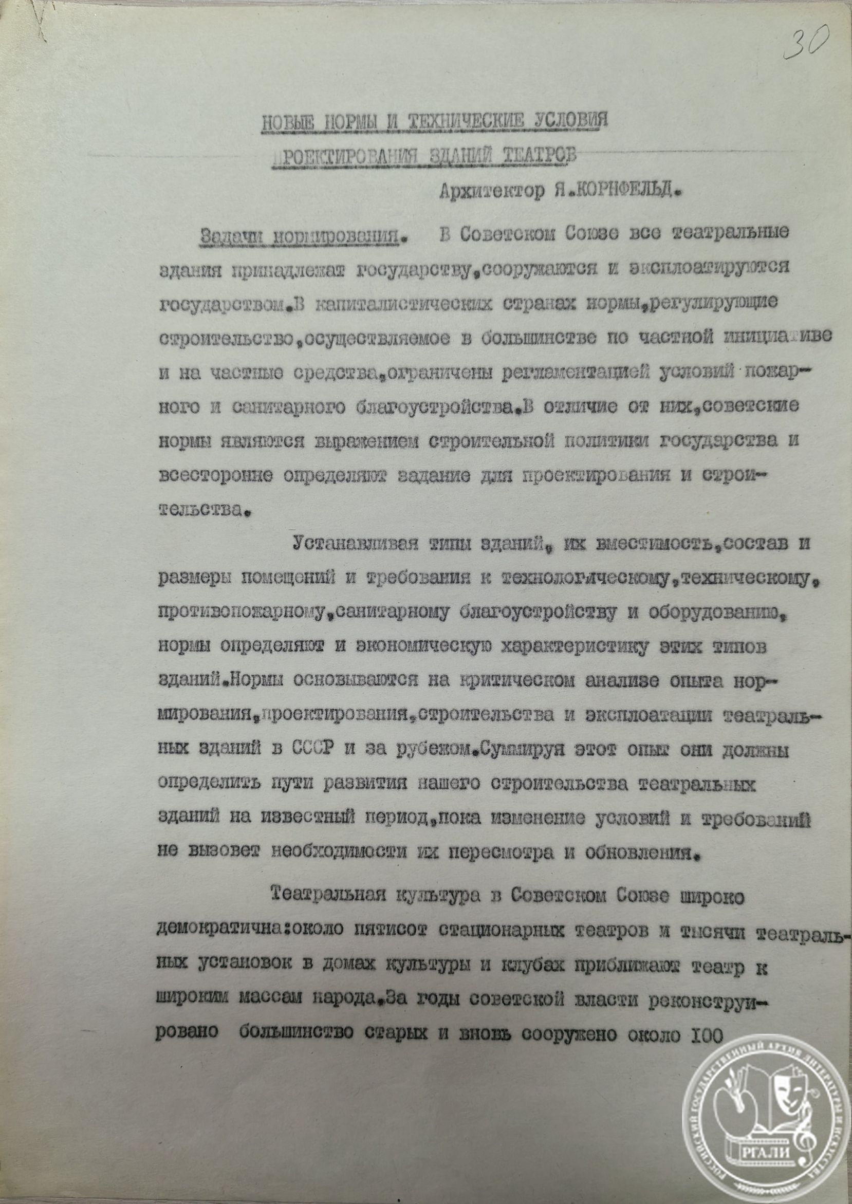 В 1939‒1940 годах Я.А. Корнфельд руководил составлением архитектурного раздела Норм по киностроительству, опубликованных Комитетом по делам кинопромышленности, был редактором книги В.П. Калмыкова «Архитектура и проектирование кинотеаров», вышедшей в 1941 году.