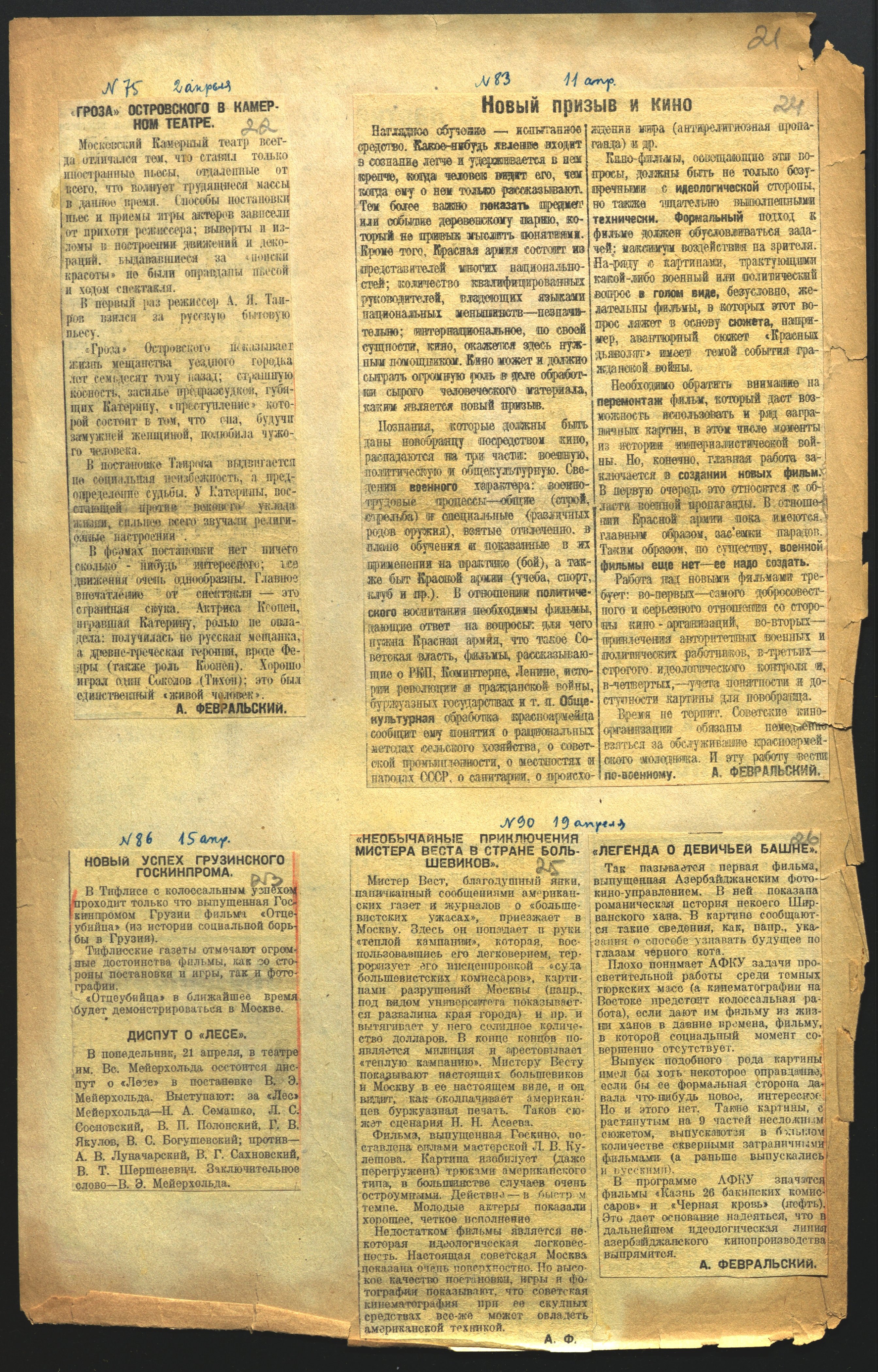 Наконец, фонд включает в себя колоссальный массив собранных Александром Вильямовичем материалов, который сам по себе − бесценный источник по истории театра. Это и служебные записки Мейерхольда, и афиши ГосТИМа, и стенограммы известных творческих диспутов 1920-х годов. Особого внимания заслуживают воспоминания мексиканского художника Диего Риверы о Маяковском, написанные в Боткинской больнице, уникальная подборка фотографий. Снимки запечатлели не только самого Февральского в окружении В.И. Немировича-Данченко, артистов ГосТИМа и грузинских деятелей культуры, но и сцены из спектаклей Театра имени Шота Руставели, кадры из фильмов 1920–1930-х годов, что делает это собрание энциклопедией истории советского театра.