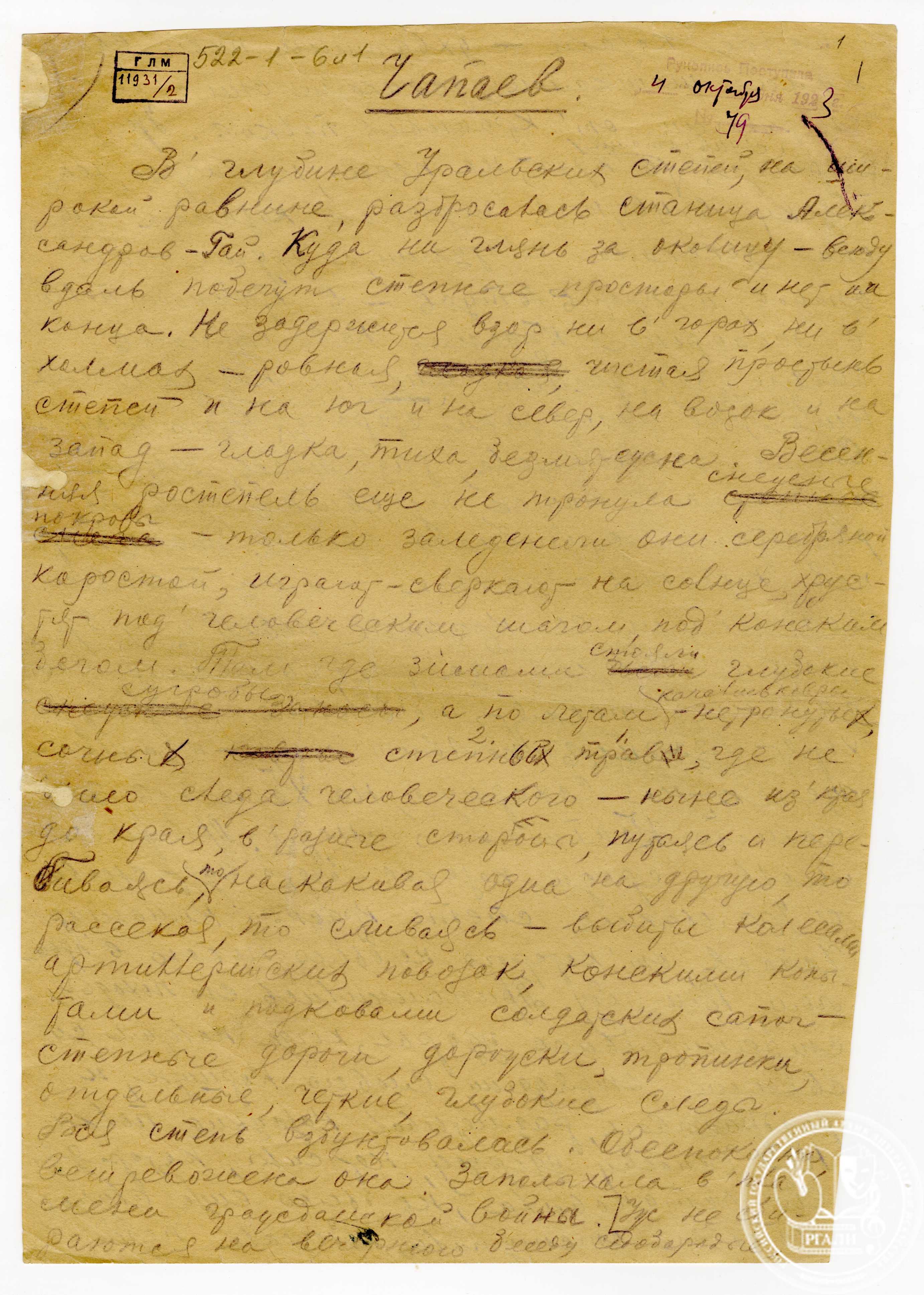Фонд № 522 Д.А. Фурманова поступил в ЦГЛА в 1941 году из Государственного литературного музея. В настоящее время по 3-м описям числится 42 единицы хранения за 1912–1960 годы. Это, прежде всего, рукописи писателя. Роман «Чапаев» представлен двумя вариантами – неполным текстом 1923 года и окончательной редакцией 1925 года, вошедшей во все последующие издания этого произведения. Из романа «Мятеж» сохранился автограф отрывка главы «По Семиреченскому тракту» 1925 года. Рассказы и очерки представлены несколькими названиями – «Дама» (1916), «Новый Афон» (1916), «Батум» (1925) и др.