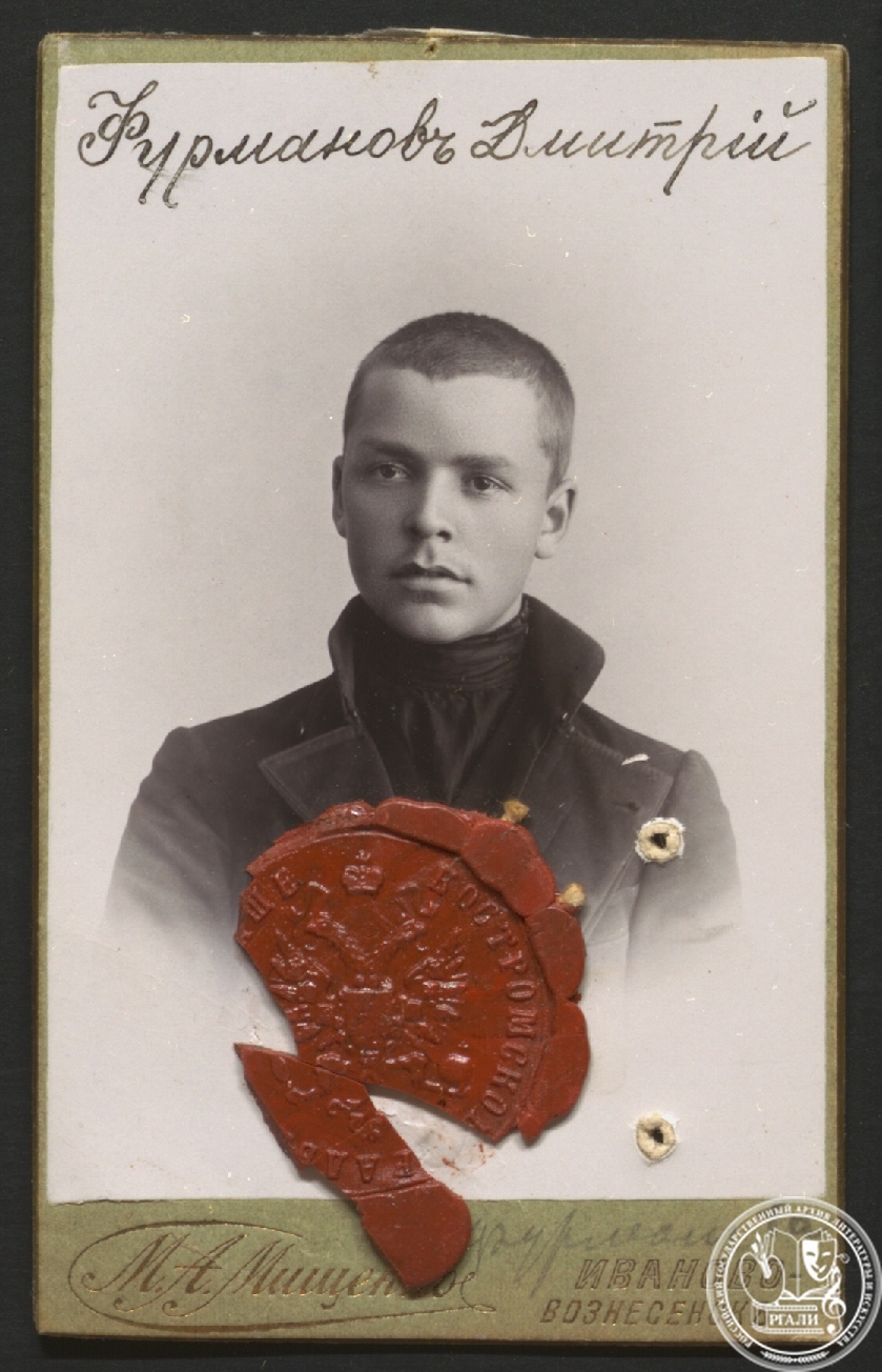 Будущий писатель Дмитрий Фурманов родился в крестьянской семье. Его отец, уволенный в запас солдат Андрей Михайлович Фурманов, происходил из крестьян Ярославской губернии, а мать, Евдокия Васильевна, была из семьи сапожника из Владимира. Первые пять лет с рождения сына семья провела в деревне. В 1896 году Фурмановы переехали в Иваново-Вознесенск, где отец занялся торговлей и устроил «кабак». В 1905–1908 годах Дмитрий обучался в «Торговой школе», а с сентября 1909 по 5 июня 1911 года ‒ в Кинешемском реальном училище имени И.А. Коновалова, полный курс которого по основному отделению закончил с отличными и хорошими отметками. В 1911–1912 учебном году он прошел в том же училище дополнительный класс, результаты которого уже были не столь впечатляющими – появились четыре удовлетворительные отметки по французскому языку, арифметике, географии и рисованию. В аттестате об окончании училища он уже именовался сыном мещанина города Суздаля Владимирской губернии. В годы учебы Фурманов увлекался чтением книг русских классиков, его сочинения ставились в пример другим учащимся, тогда же пришла к нему любовь к поэзии и его тетради наполнились стихами.