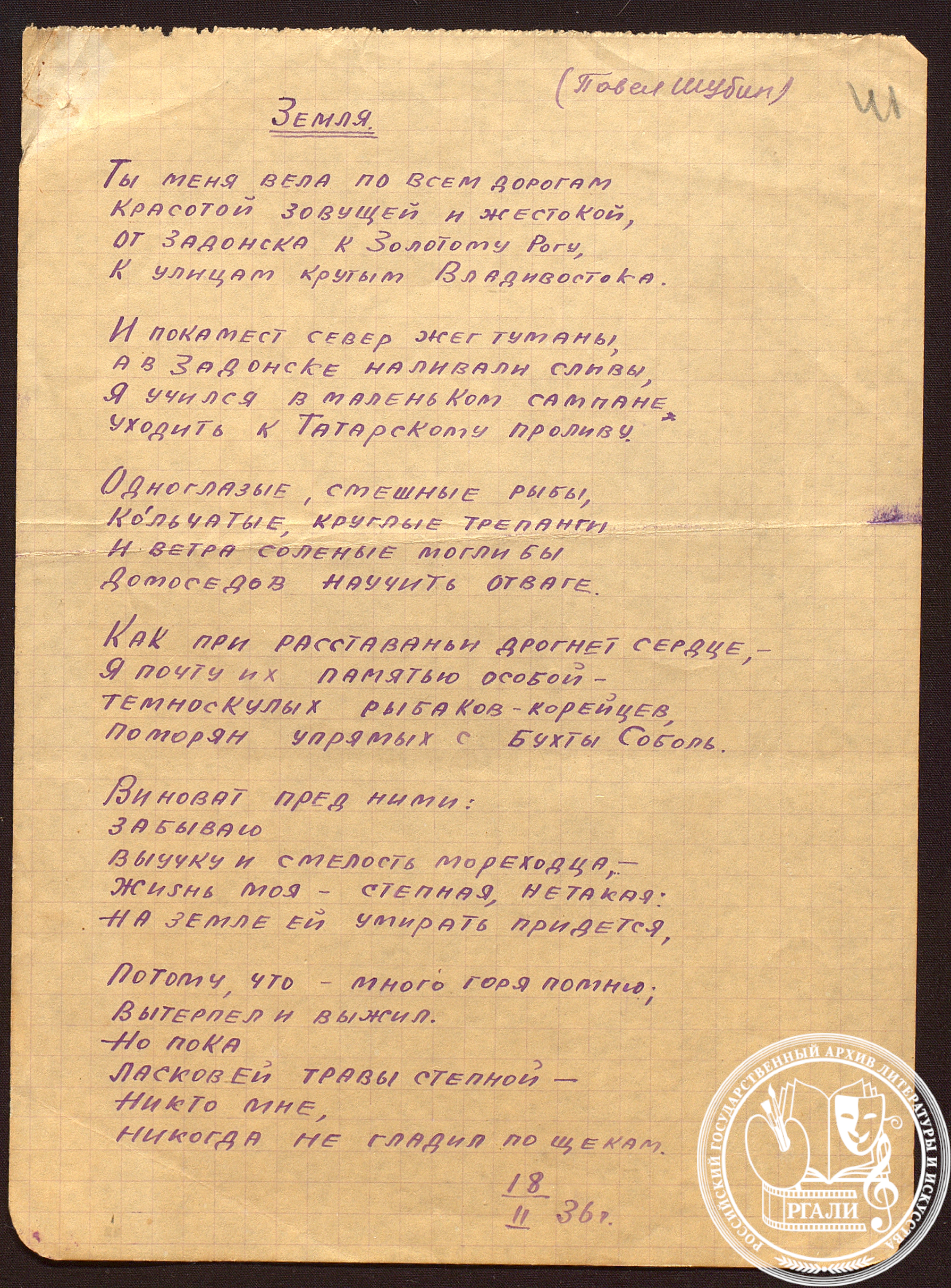 Определение «ныне почти забытый поэт» бывает не вполне справедливым даже по отношению к авторам XIX века, но как горько оно для поэта, творившего меньше ста лет назад! Тем не менее, Павел Николаевич Шубин, автор десятков исключительных по своей лирической мощи стихотворений, в силу разных обстоятельств действительно незаслуженно находится в наше время на периферии читательского внимания. Ему не повезло оказаться в студенческой компании ифлийцев, свято чтивших память товарищей до конца своих дней, он не вращался в юности в «миру литинститутском». Но это не помешало оформиться его самобытному таланту, который в полную силу развернулся в годы войны.