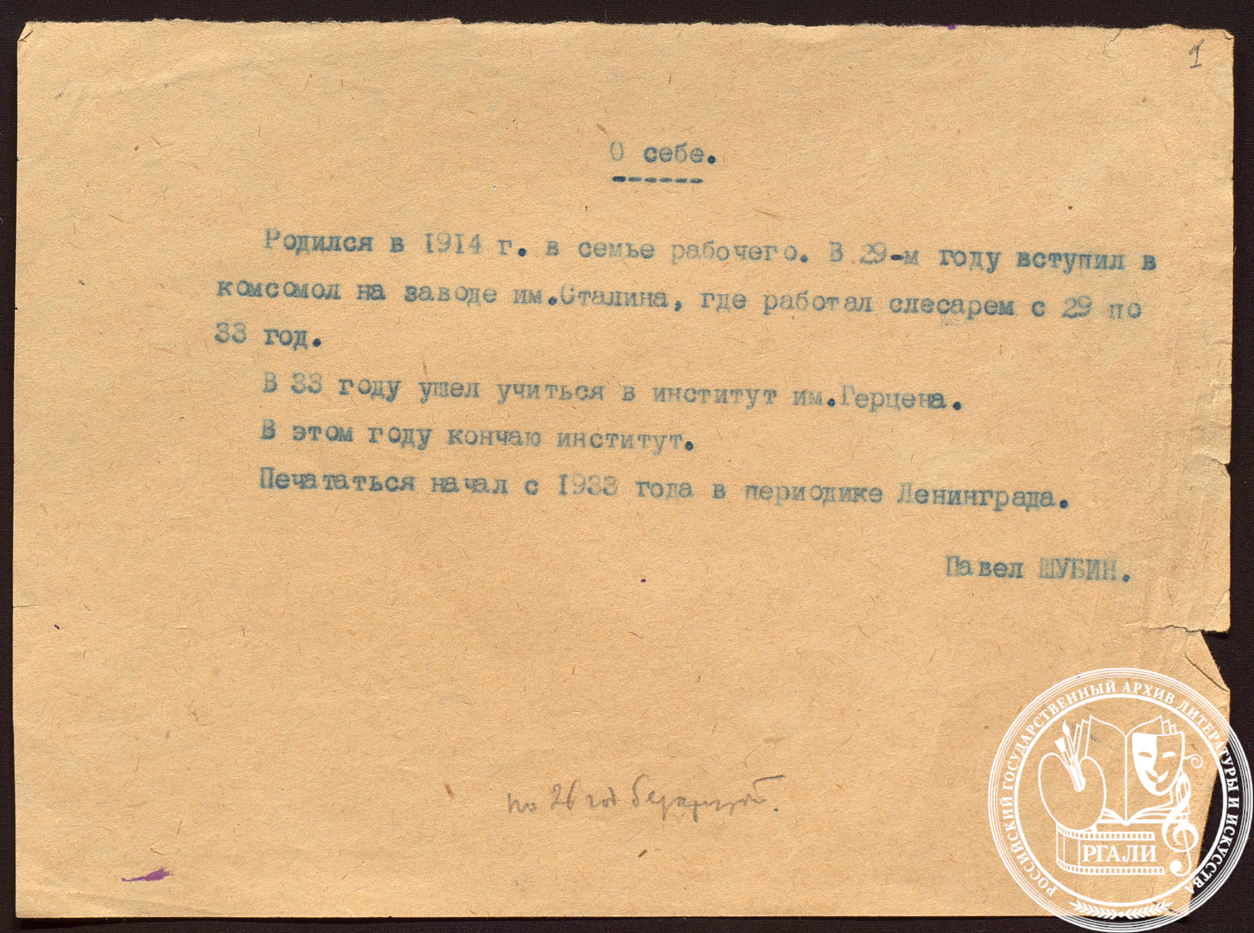 Чтобы обеспечить себя, Шубин пошел работать слесарем на Ленинградский металлический завод им. И.В. Сталина и параллельно учился на вечернем отделении конструкторского техникума. К этому же времени относятся его первые поэтические опыты, которые с 1933 года печатались в ленинградской периодике. Вскоре он окончательно решил связать свою жизнь с литературой и по путевке от ЛМЗ поступил на филологический факультет Ленинградского пединститута им. А.И. Герцена. Будучи студентом, в 1937 году он опубликовал свой первый сборник стихов «Ветер в лицо» и в 1939-м выпускался из института уже в статусе подающего надежды молодого поэта. В ранних стихах, сохранившихся в его личном архивном фонде № 2162 в РГАЛИ, еще чувствуется чужое влияние, но есть в них и свежие, сильные строки и образы, крепкий задел на будущее.