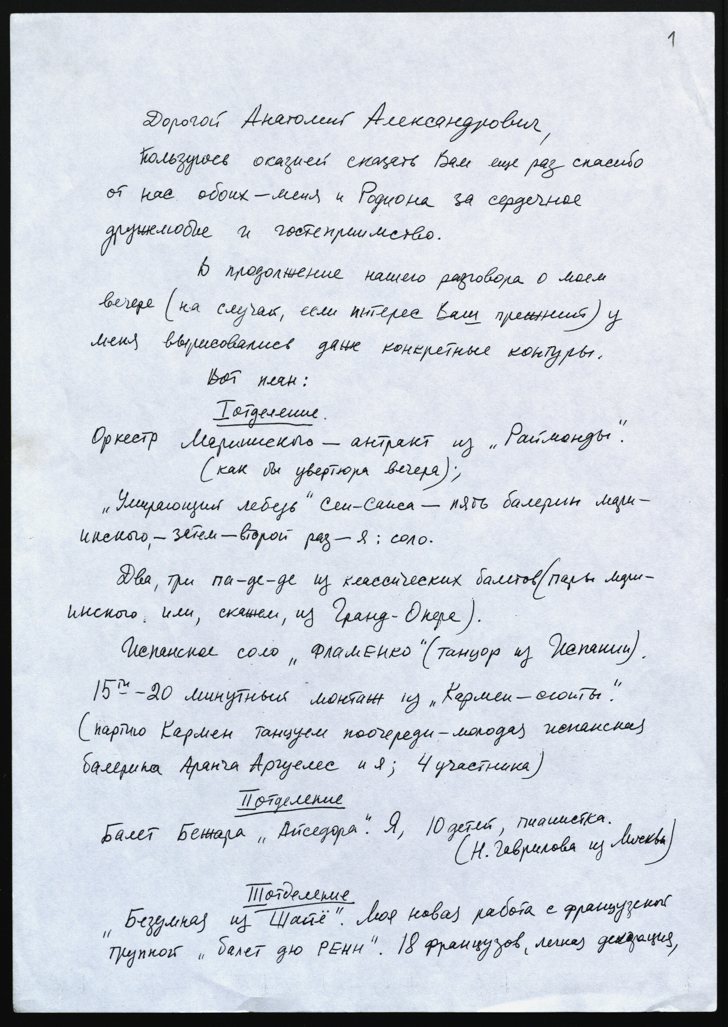 М.М. Плисецкая. Письмо А.А. Собчаку с программой концерта к 50-летию сценической деятельности. 1993 г. Российский государственный архив литературы и искусства Ф. 3266. Оп. 1. Ед. хр. 210. Л. 1. Ксерокопия автографа.