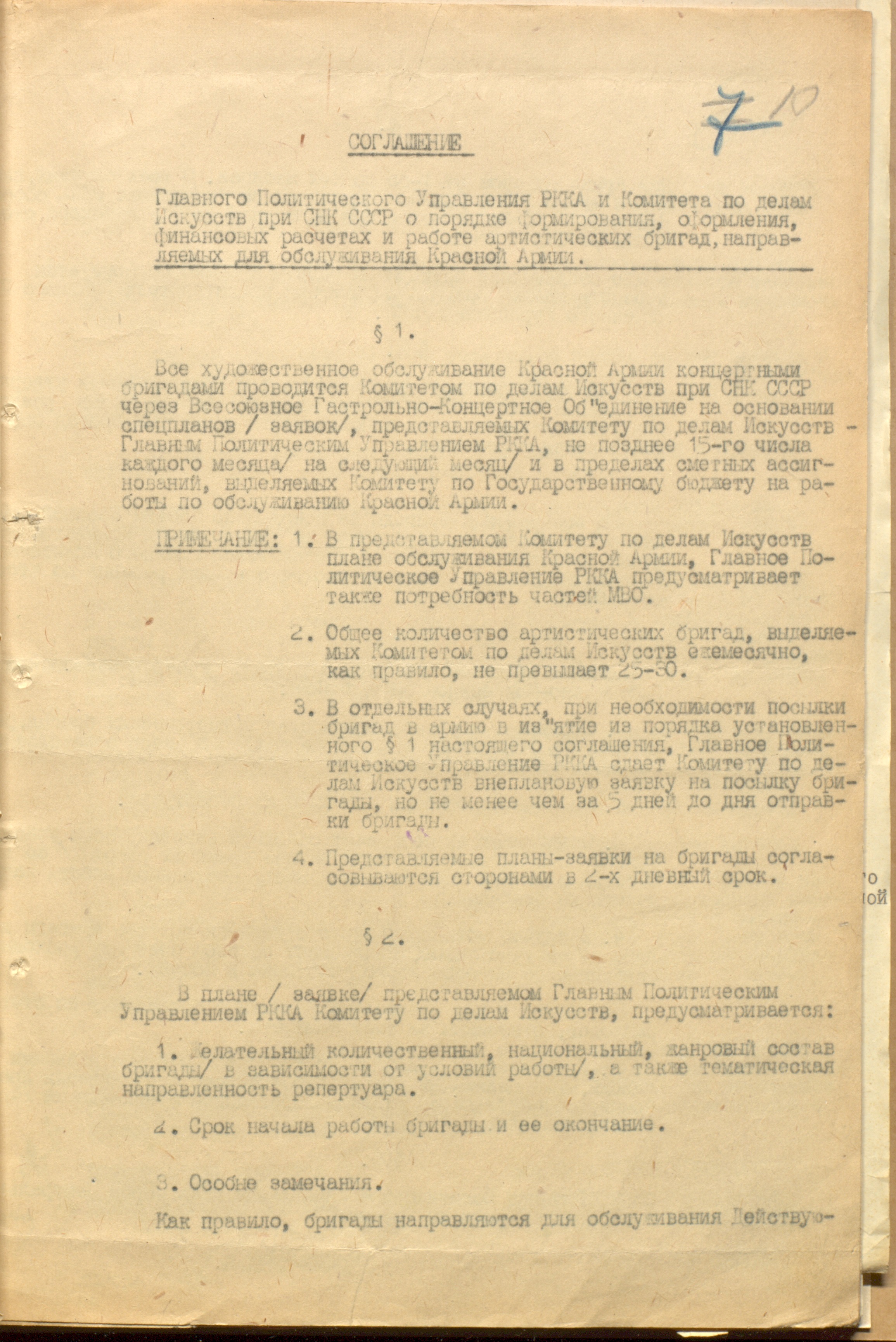 Соглашение ГлавПУРККА и КПДИ при СНК СССР о порядке формирования, оформления, финансовых расчетах и работе артистических бригад, направляемых для обслуживания РККА. 5 января 1943 г. Машинопись. Ф. 962. Оп. 3. Ед. хр. 1143. Л. 10-11