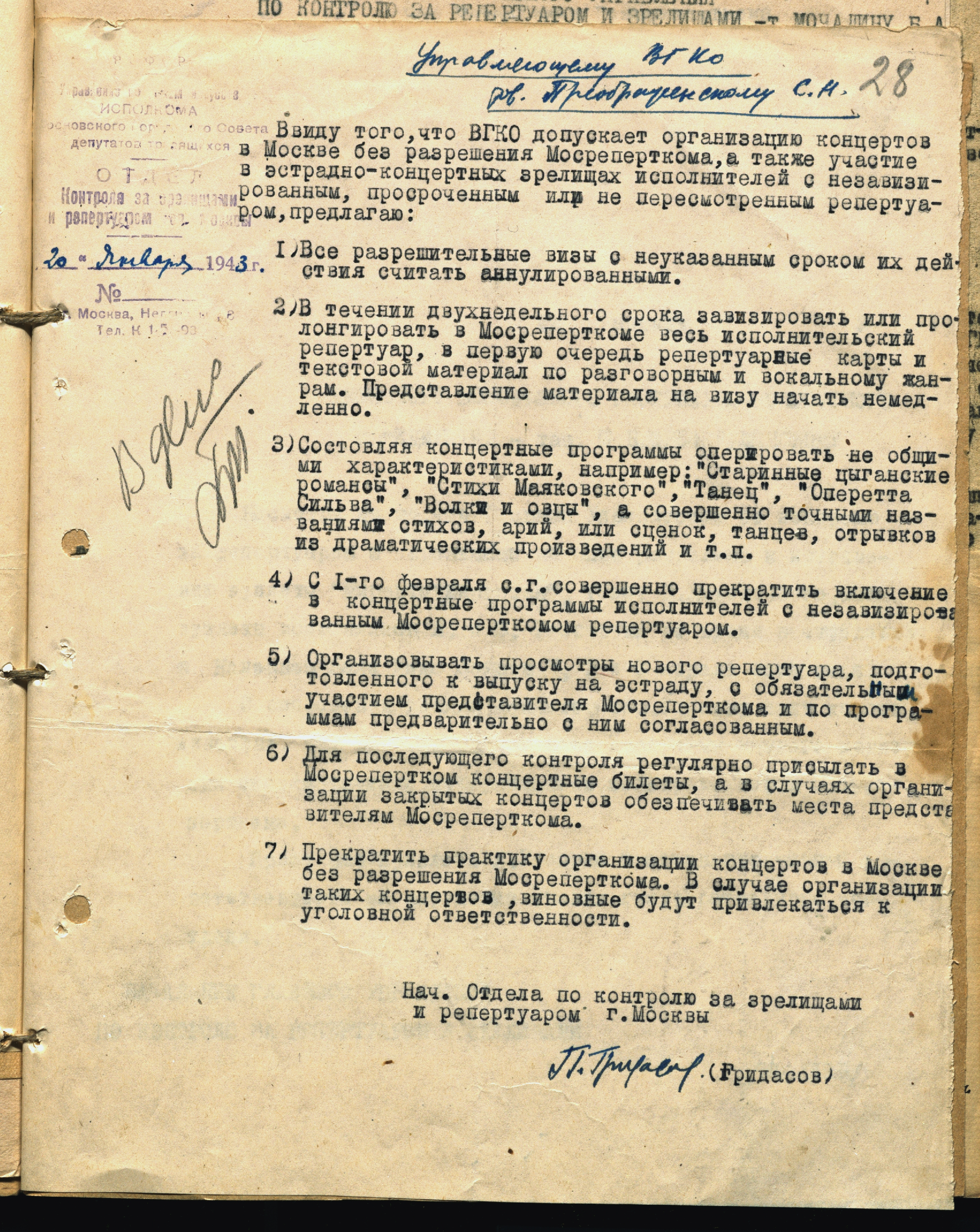Письмо начальника отдела по контролю за зрелищами и репертуаром Управления по делам искусств Мосгорисполкома П.П. Гридасова управляющему ВГКО С.Н. Преображенскому об обязательном участии Мосреперткома в визировании эстрадно-концертных программ. 20 января 1943 г. Авторизованная машинопись. Ф. 962. Оп. 3. Ед. хр. 1163. Л. 28