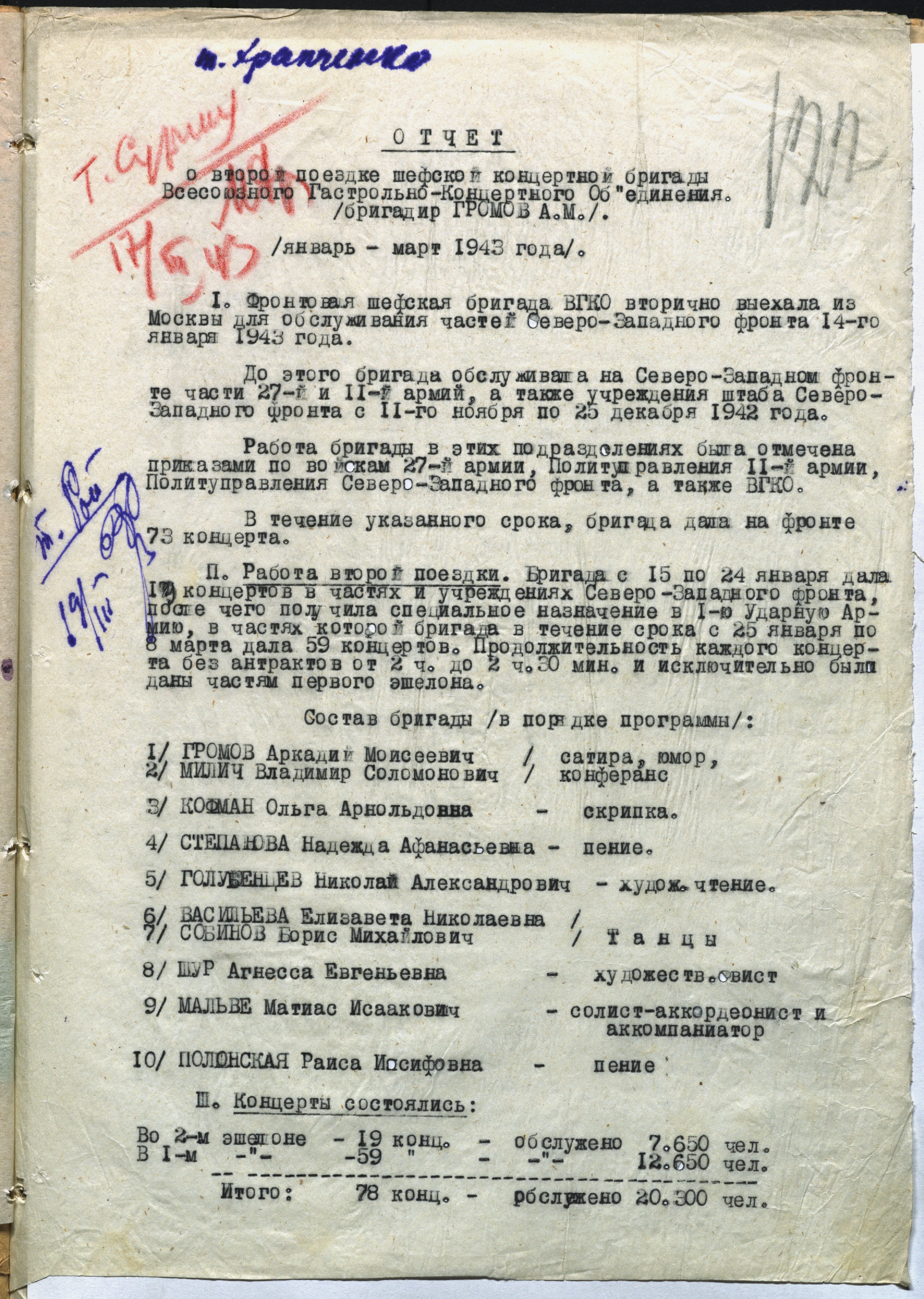 Отчет о второй поездке шефской концертной бригады Всесоюзного гастрольно-концертного объединения (бригадир А.М. Громов) в части Северо-Западного фронта в январе-марте 1943 г. 14 марта 1943 г. Машинопись. Ф. 962. Оп. 5. Ед. хр. 640. Л. 122-127