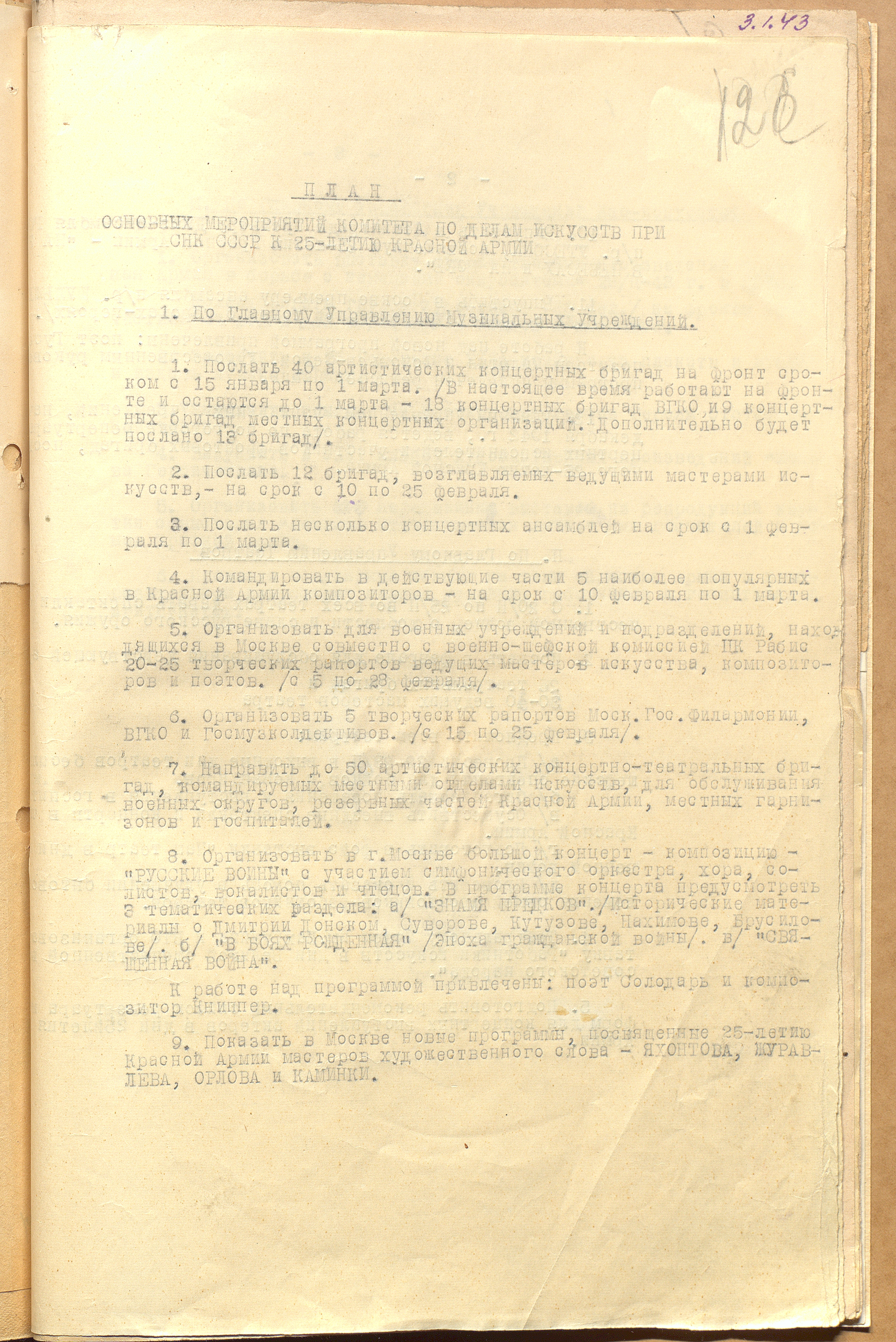 План основных мероприятий КПДИ при СНК СССР к 25-летию РККА. [Январь] 1943 г. Машинопись. Ф. 962. Оп. 3. Ед. хр. 1116. Л. 126-127