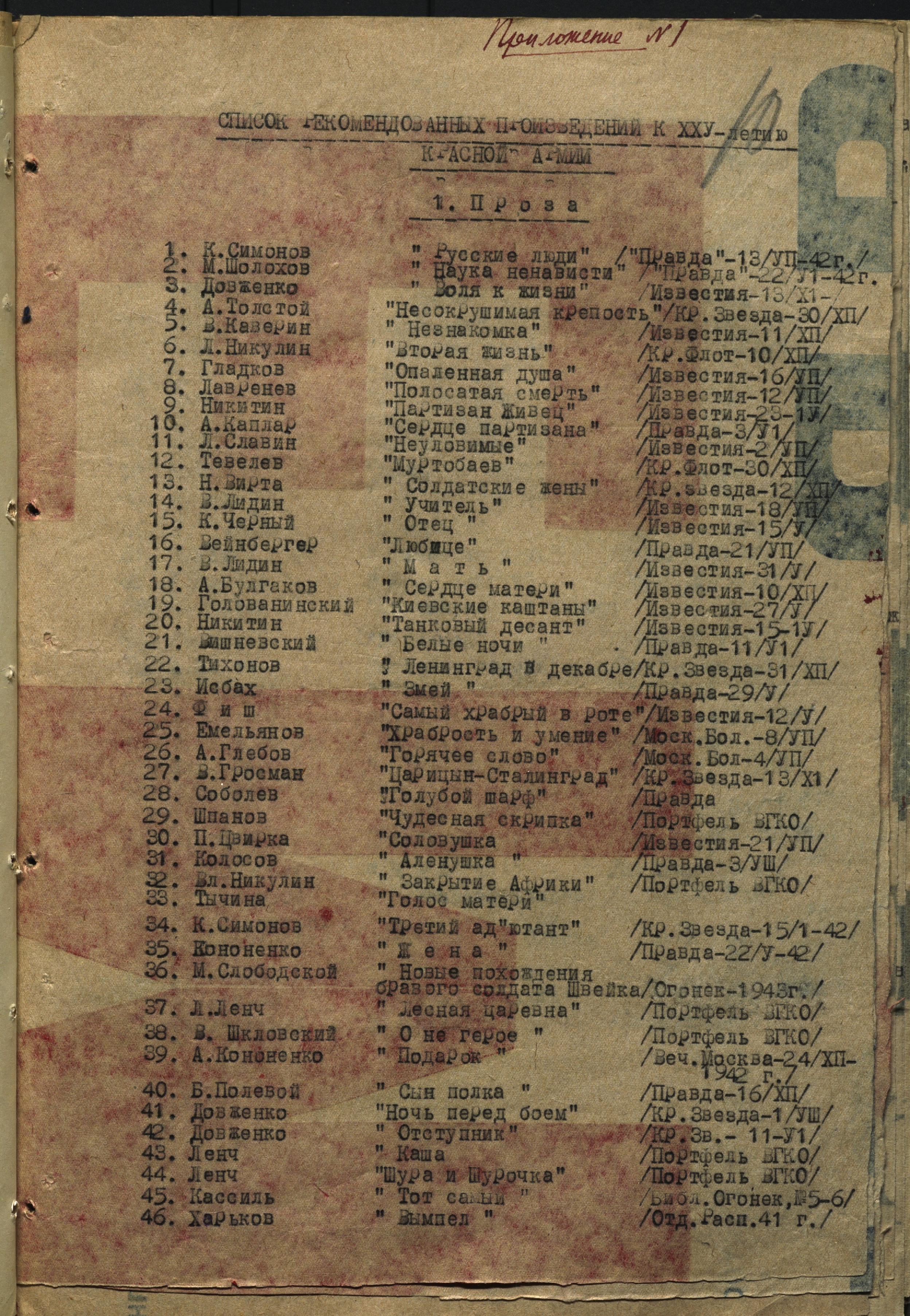 Список рекомендованных к исполнению произведений на 25-летие Красной армии. [Февраль] 1943 г. Машинопись. Ф. 962. Оп. 5. Ед. хр. 640. Л. 10-15
