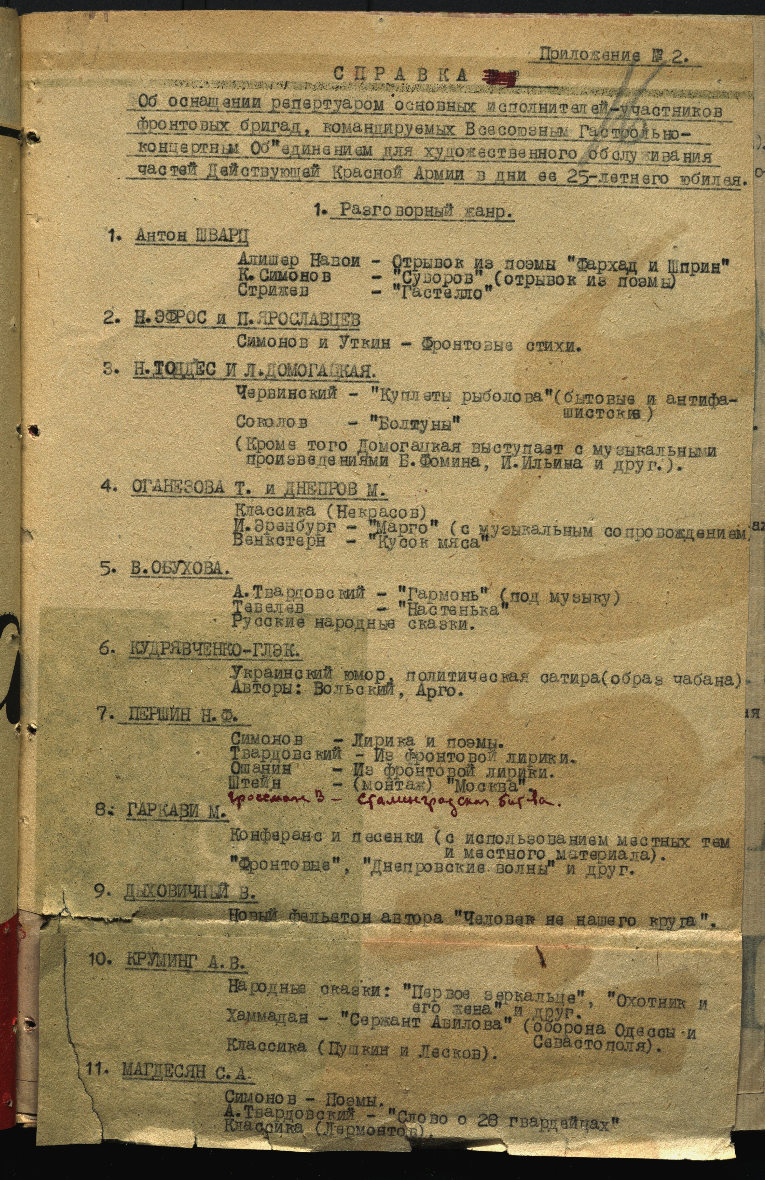 Справка о репертуаре основных исполнителей — участников фронтовых бригад, командируемых ВГКО для празднования 25-летия Красной армии. [Февраль] 1943 г. Машинопись. Ф. 962. Оп. 5. Ед. хр. 640. Л. 16-20