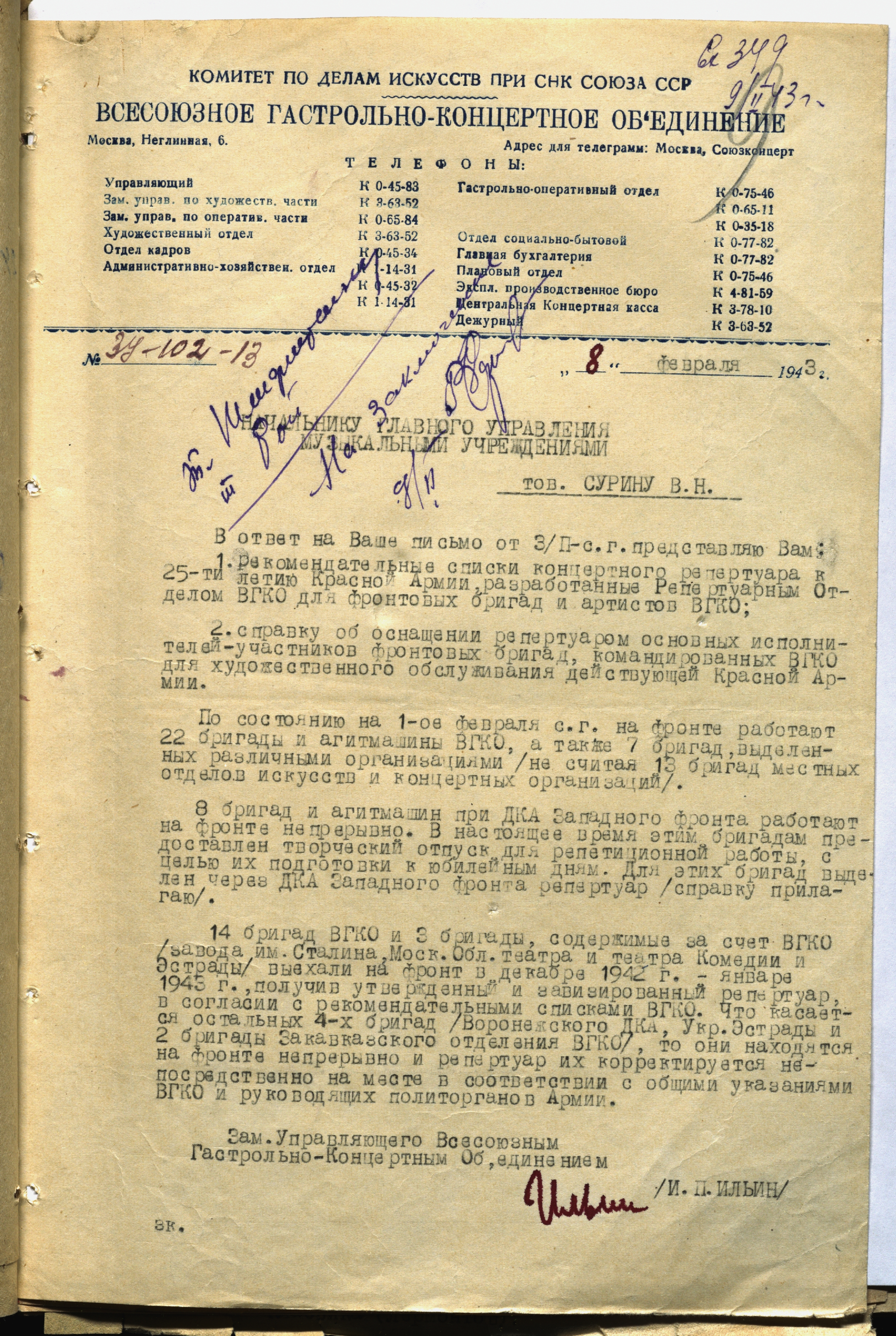 Письмо заместителя управляющего ВГКО И.П. Ильина начальнику Главного управления музыкальными учреждениями КПДИ при СНК СССР В.Н. Сурину о количестве и репертуаре фронтовых бригад ВГКО по состоянию на 1 февраля 1943 г. Машинопись. Ф. 962. Оп. 5. Ед. хр. 640. Л. 9