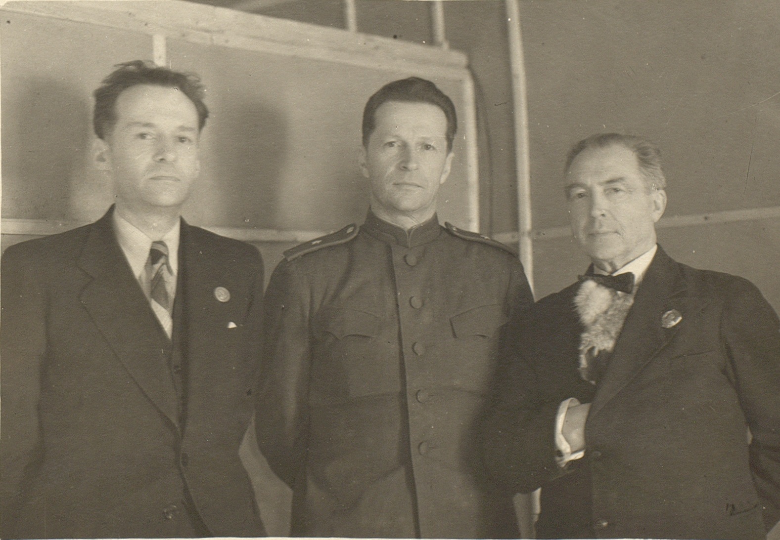 Фотография участников фронтовой концертной бригады Малого театра В.Н. Аксенова (слева) и А.А. Остужева (справа) с командующим 3-й воздушной армией генерал-майором авиации М.М. Громовым (в центре). Февраль-март 1943 г. Ф. 2403. Оп. 1. Ед. хр. 470. Л. 1