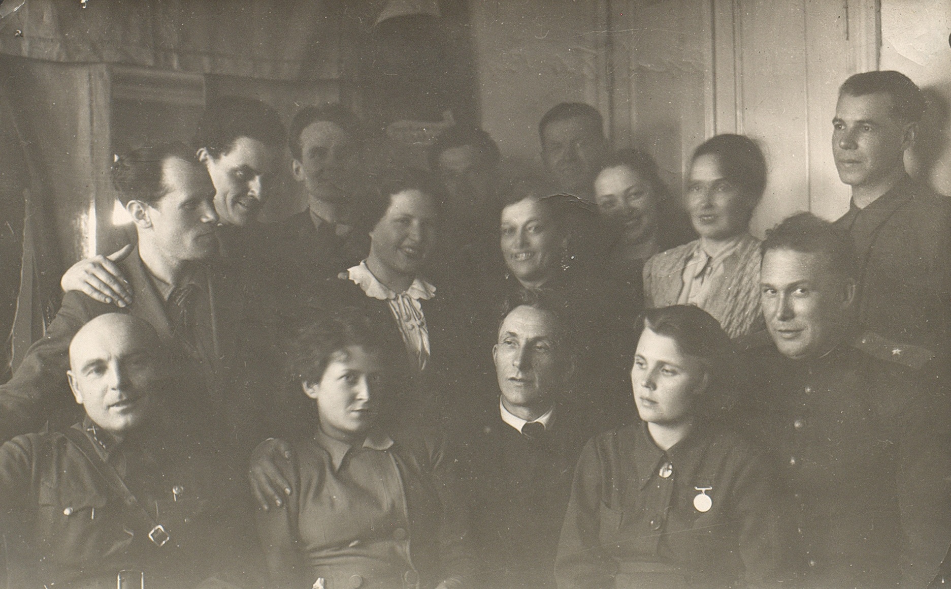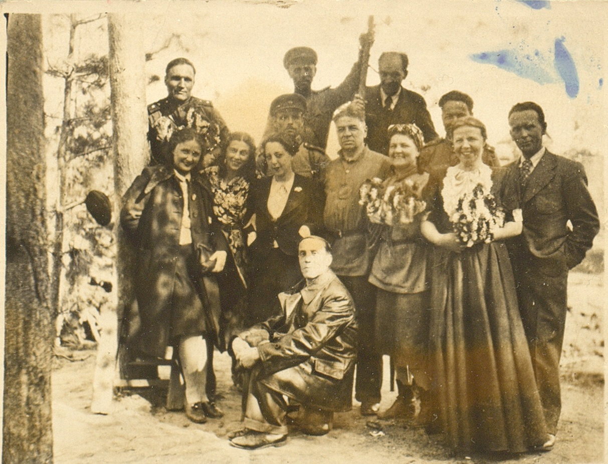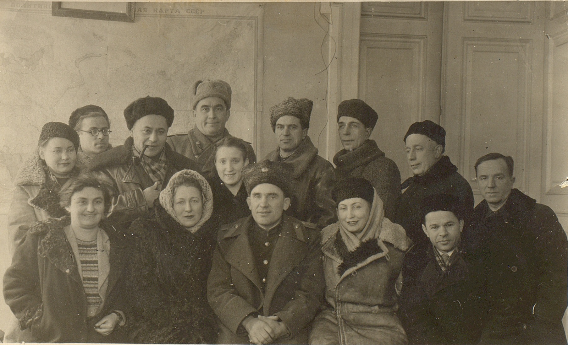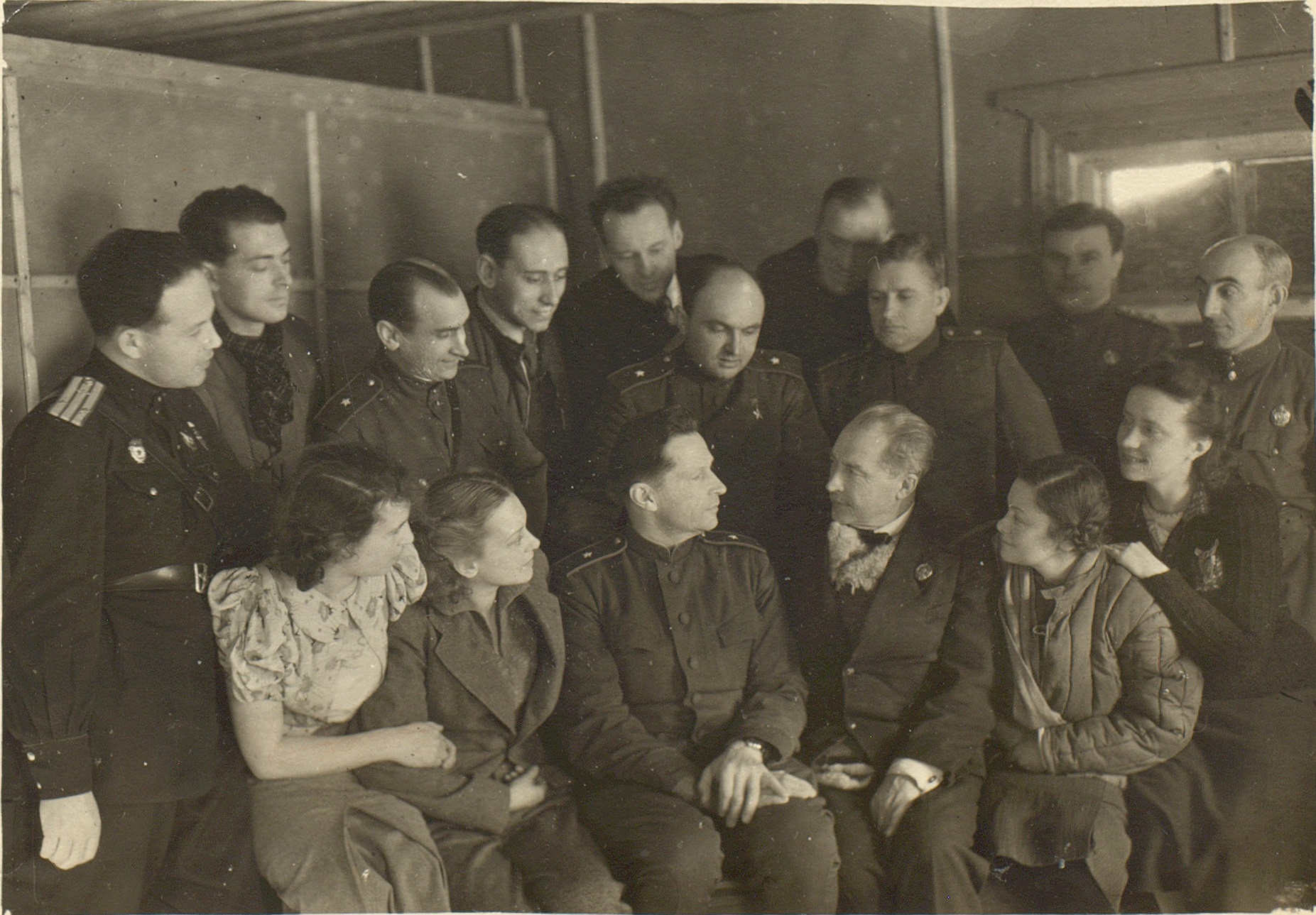 Фотография участников фронтовой бригады Московского театра драмы во время выезда на фронт. В первом ряду сидят (слева направо): актрисы Н.М. Тер-Осипян и А.Я. Москалева, командир 36-й авиационной дивизии дальнего действия, генерал-майор авиации В.Ф. Дрянин, вокалистка [Г.А. Барилко], артист оркестра [И.Г. Дегтяр]. Во втором ряду стоят (слева направо): [Д. Будянская], артист оркестра В.А. Голубев, актер Л.Н. Свердлин (второй слева во втором ряду), неустановленные лица, актеры В.А. Латышевский и Л.Н. Титов, артист оркестра А.Н. Курич. Г. Щучин Гродненской обл. Белорусской ССР. [22] января 1945 г. Ф. 2953. Оп. 1. Ед. хр. 614. Л. 3
