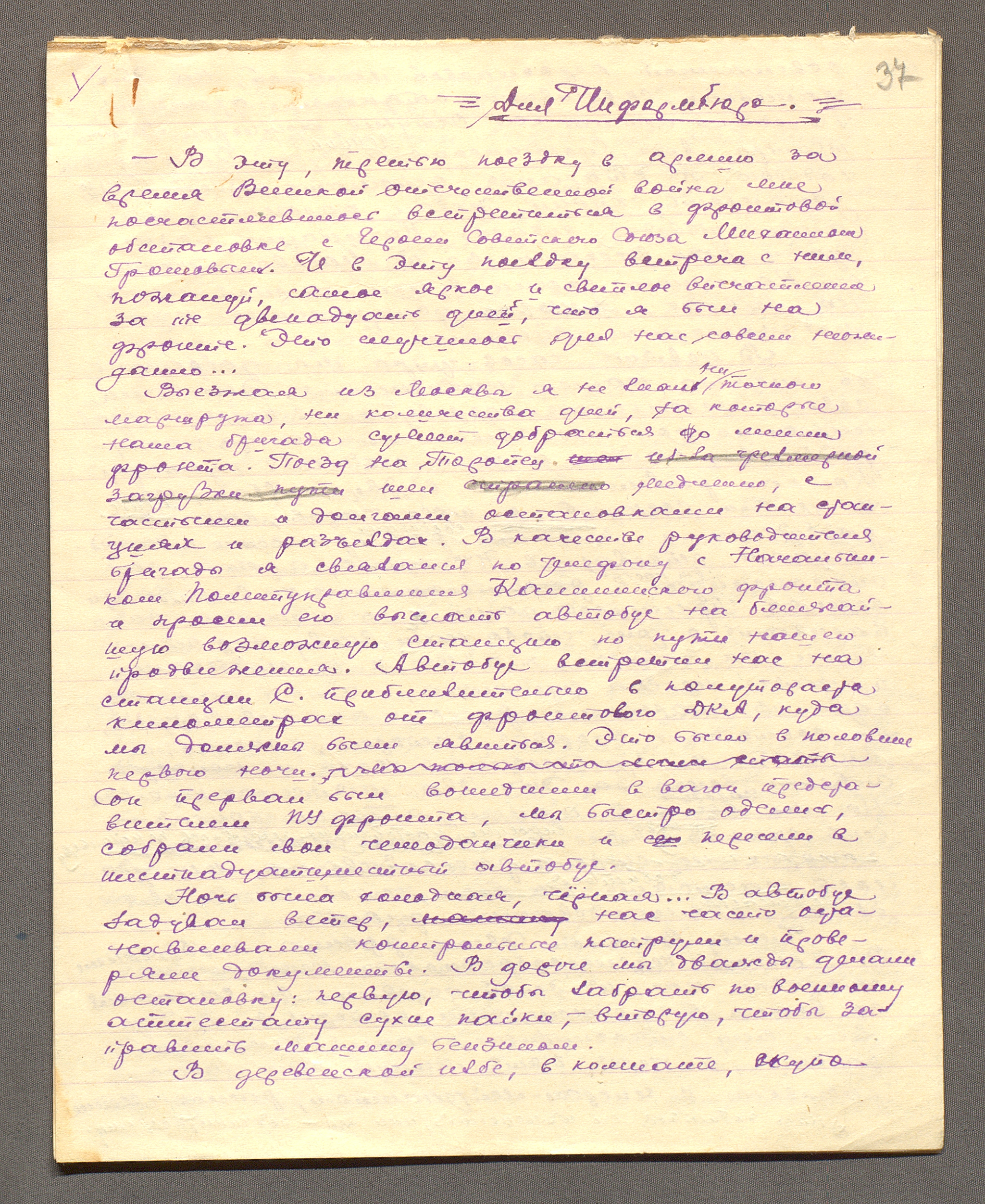 Воспоминания В.Н. Аксенова о поездке фронтовой бригады Малого театра в расположение 3-й Воздушной армии и встрече с генерал-майором авиации М.М. Громовым. 15 марта 1943 г. Автограф. Ф. 2403. Оп. 1. Ед. хр. 116. Л. 37-41об