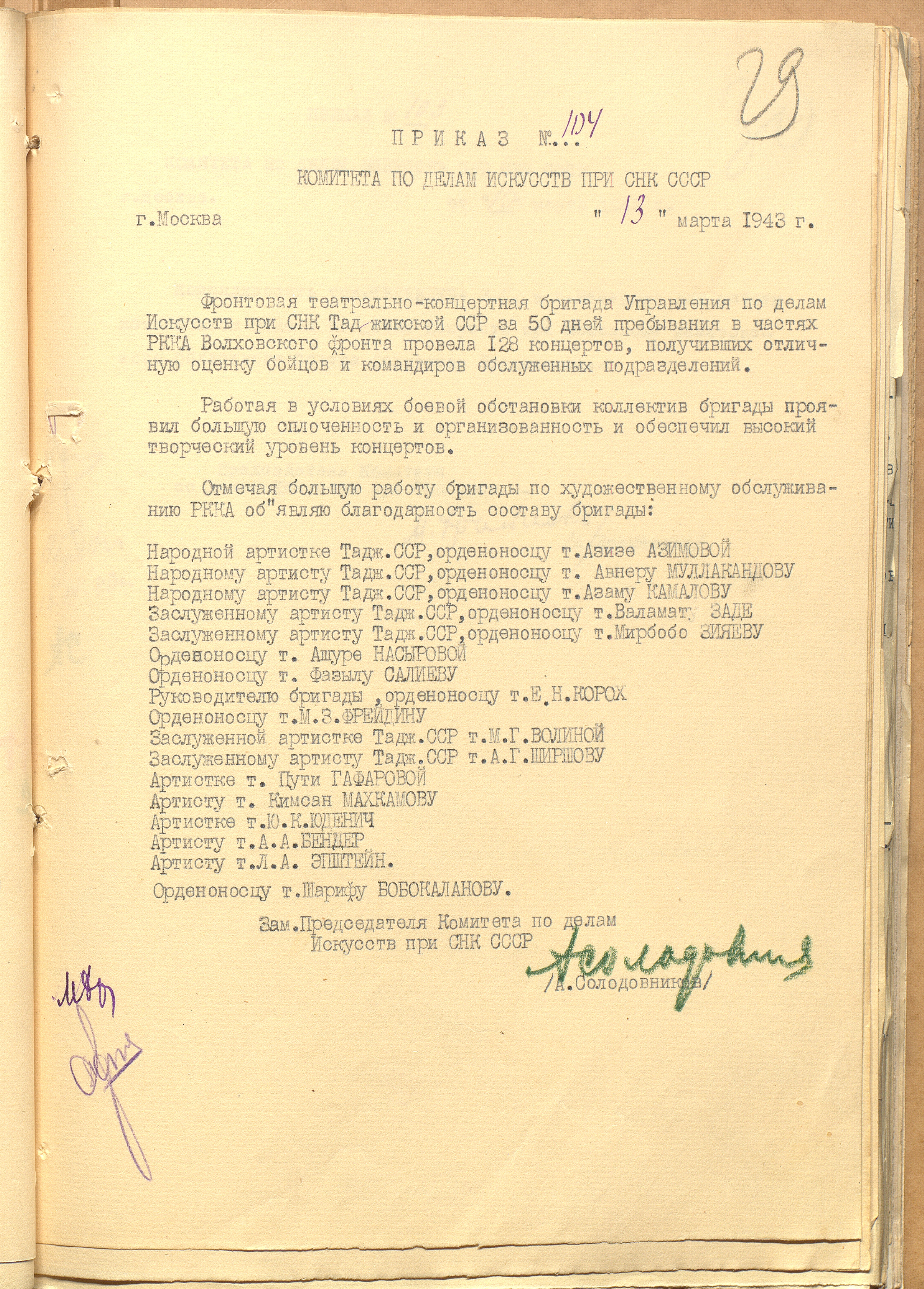 Приказ КПДИ при СНК СССР № 104 с благодарностью артистам фронтовой бригады Управления по делам искусств при СНК Таджикской ССР. 13 марта 1943 г. Машинопись. Ф. 962. Оп. 3. Ед. хр. 1116. Л. 29