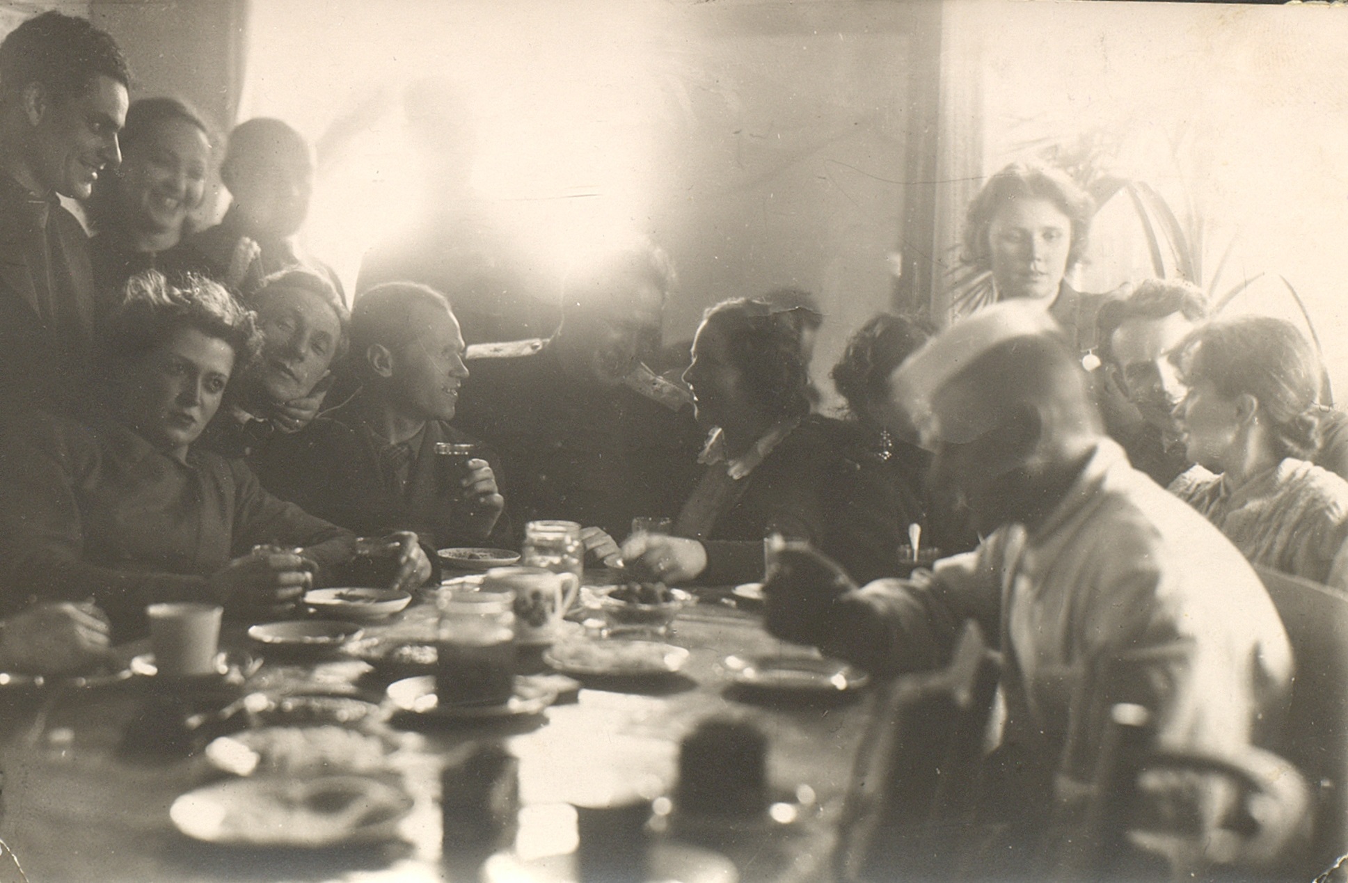 Фотография участников сборной фронтовой бригады артистов Театра им. Станиславского и Немировича-Данченко, Московского театра драмы и Московского театра оперетты во время поездки на Сталинградский фронт. Слева за столом сидят (слева направо): Е.В. Измайловская, А.М. Калинцев, В.В. Моргунов; за ними стоят (слева направо): Г.И. Поляков, Е.В. Новикова, батальонный комиссар, полковник В.В. Копров. За столом в центре – командир 19-й гвардейской Сталинградской тяжёлой артиллерийской дивизии, генерал-майор артиллерии В.П. Дмитриев, справа от него – О.П. Матисова, неустановленное лицо, Л.Г. Дмитриева (стоит), А.Э. Динер, Л.В. Виноградская. Март 1943 г. Ф. 2337. Оп. 2. Ед. хр. 186. Л. 4