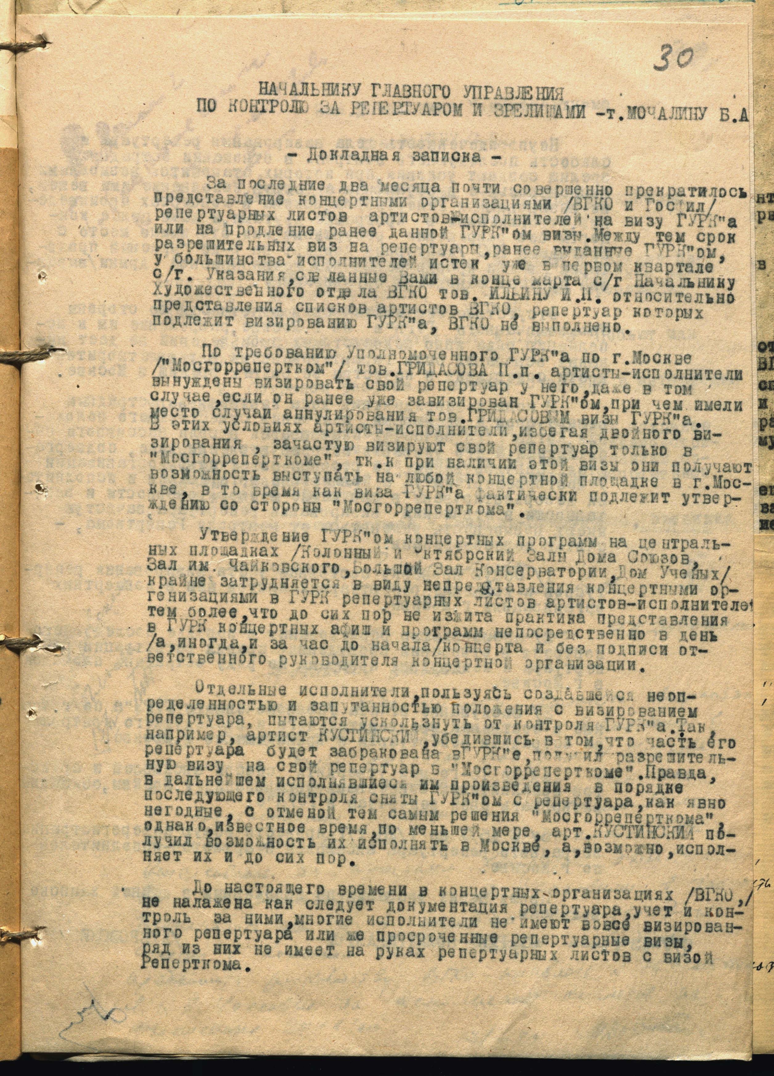 Докладная записка старшего политредактора отдела контроля КПДИ при СНК СССР М.А. Дубровского начальнику Главреперткома Б.А. Мочалину о необходимости контроля за репертуаром концертных исполнителей. 5 мая 1943 г. Машинопись. Ф. 962. Оп. 3. Ед. хр. 1163. Л. 30-30об