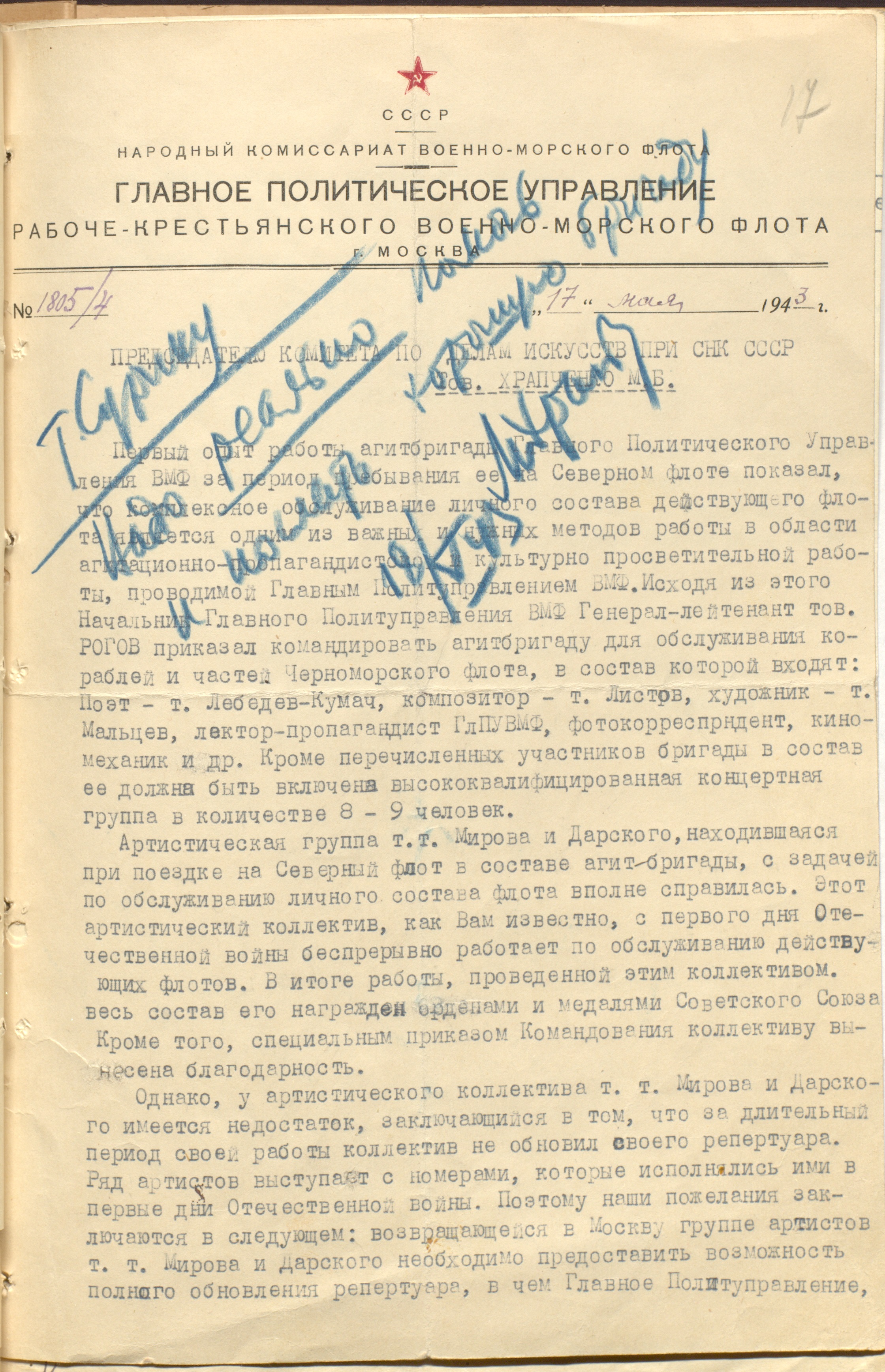 Письмо начальника 4-го отдела Главного политуправления Военно-морского флота полковника Портова М.Б. Храпченко с отзывом о работе и репертуаре фронтовой концертной бригады под руководством Мирова и Дарского, выступавшей на Северном флоте, и просьбой о формировании бригады для обслуживания Черноморского флота. 17 мая 1943 г. (Резолюция М.Б. Храпченко начальнику Главного управления музыкальными учреждениями КПДИ при СНК СССР В.Н. Сурину от 18 мая 1943 г.: «Надо реально помочь и послать хорошую бригаду»). Машинопись. Ф. 962. Оп. 3. Ед. хр. 1172. Л. 17-18