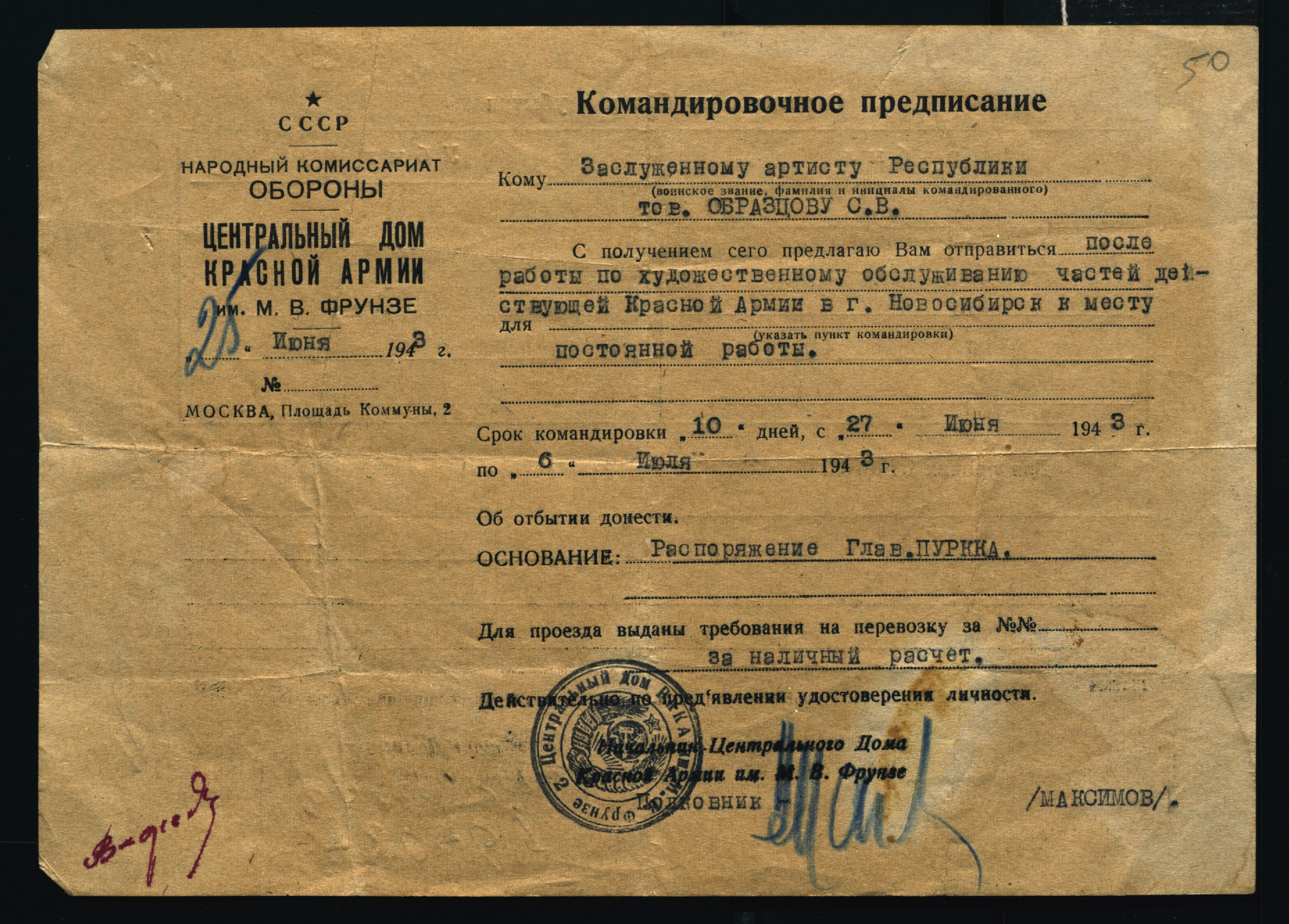 Командировочное предписание Центрального дома Красной армии, выданное С.В. Образцову для работы по художественному обслуживанию частей РККА. 25 июня 1943 г. Машинопись. Ф. 2732. Оп. 1. Ед. хр. 1172. Л. 50