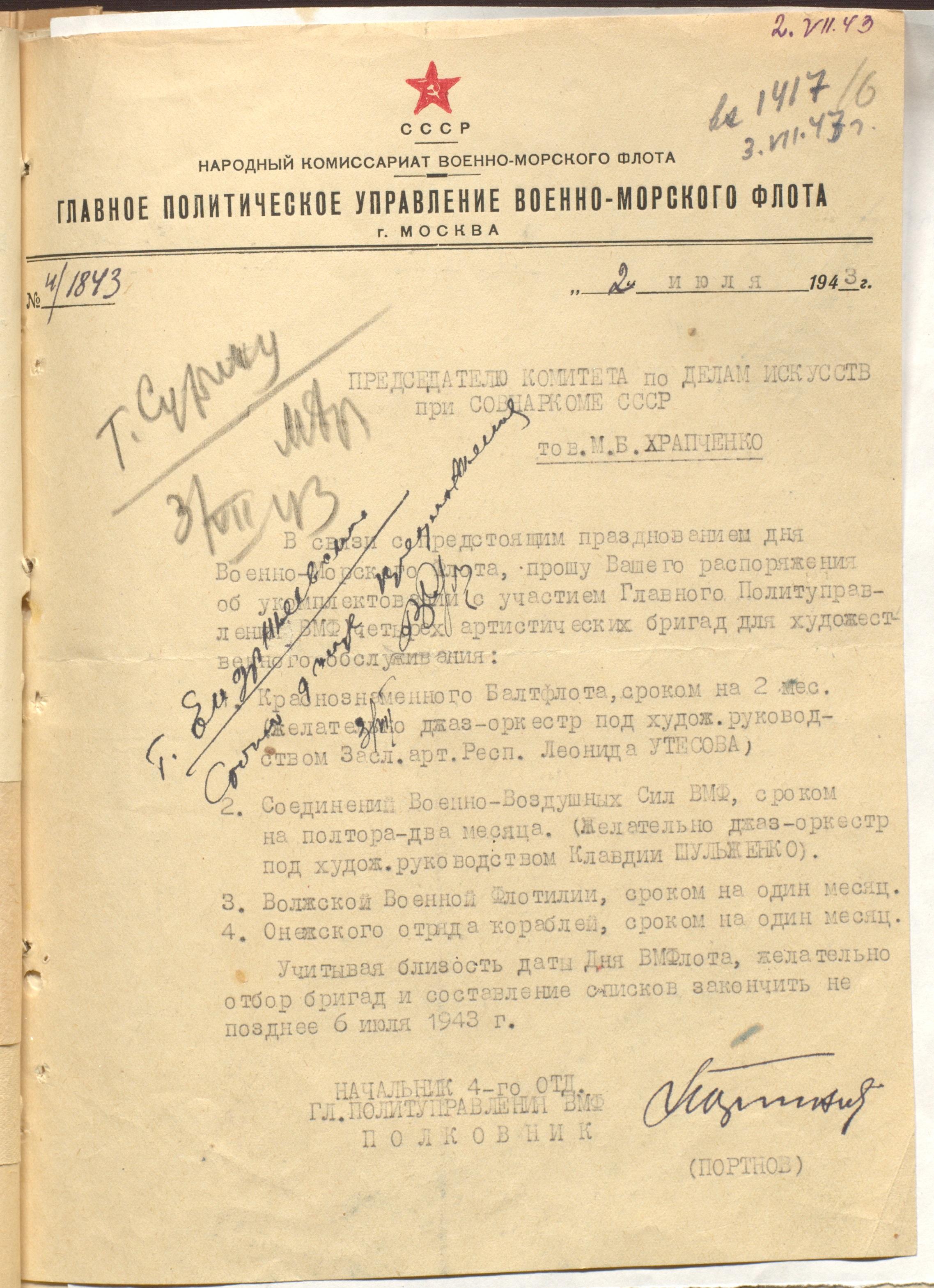 Письмо начальника 4-го отдела Главного политуправления военно-морского флота полковника Портова М.Б. Храпченко о командировании для обслуживания частей ВМФ СССР концертных бригад, в том числе джаз-ансамблей под руководством Л.О. Утесова и К.И. Шульженко. 2 июля 1943 г. Машинопись. Ф. 962. Оп. 3. Ед. хр. 1172. Л. 16